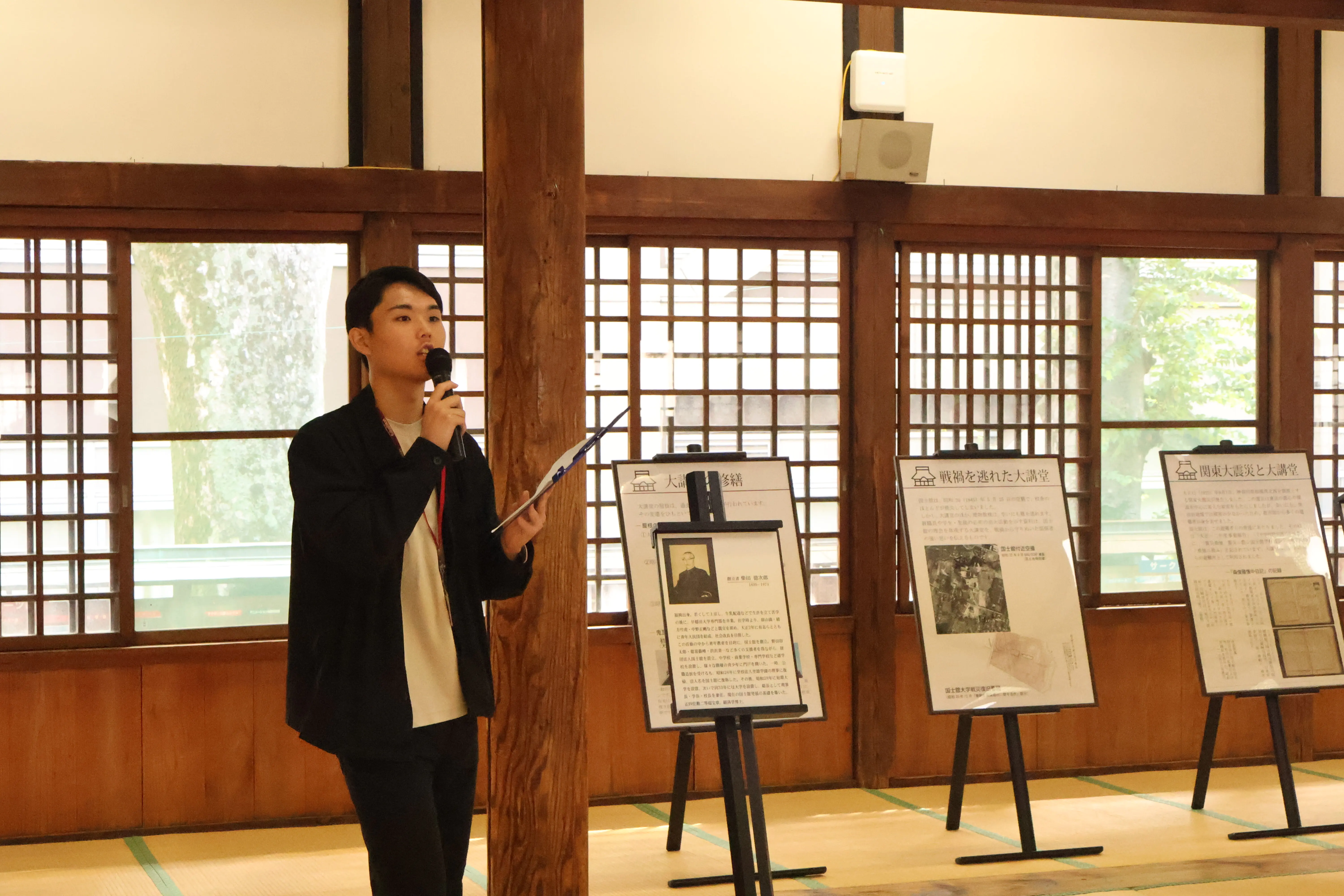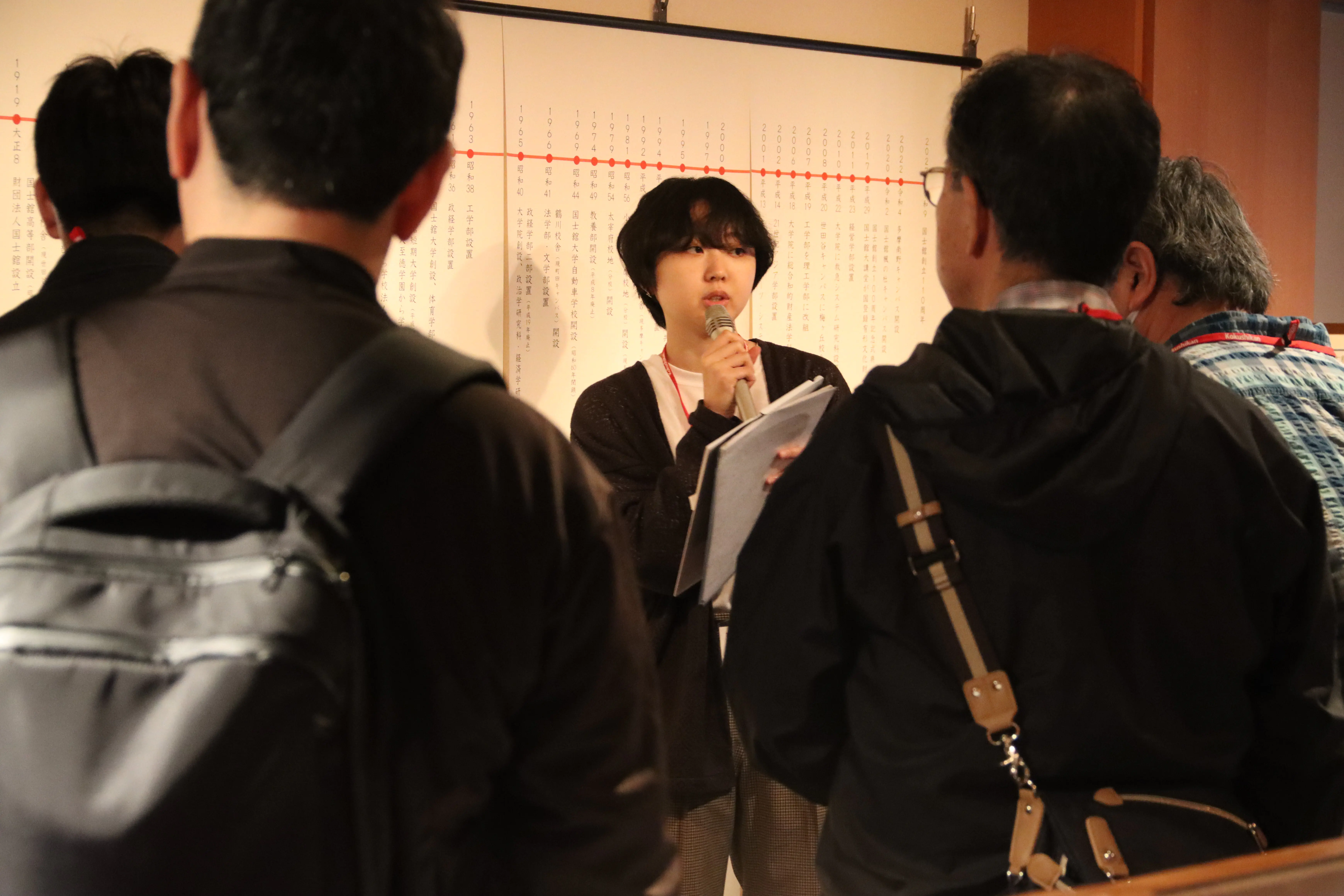 参加者らは、本学学生ガイドによる解説に耳を傾けながら、建造物の特徴や創建時の時代背景について理解を深めていました。その後、柴田会舘内の資料展示室に移動し、本学の歴史を今に伝える数々の資料を観覧しました。参加者からは、構造や展示物などについて多くの質問が寄せられ、関心の高さがうかがえました。