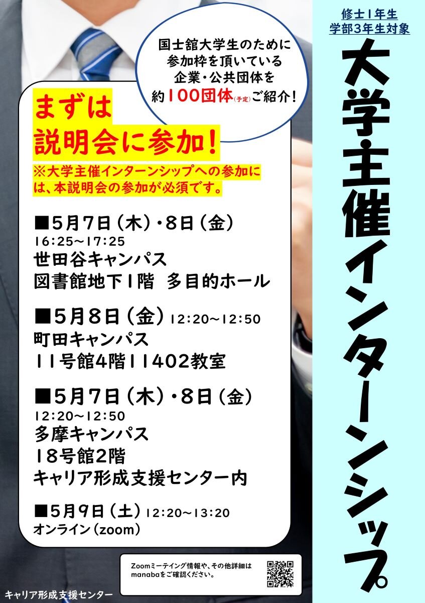「大学主催インターンシップ」を実施します。希望者はご参加ください。