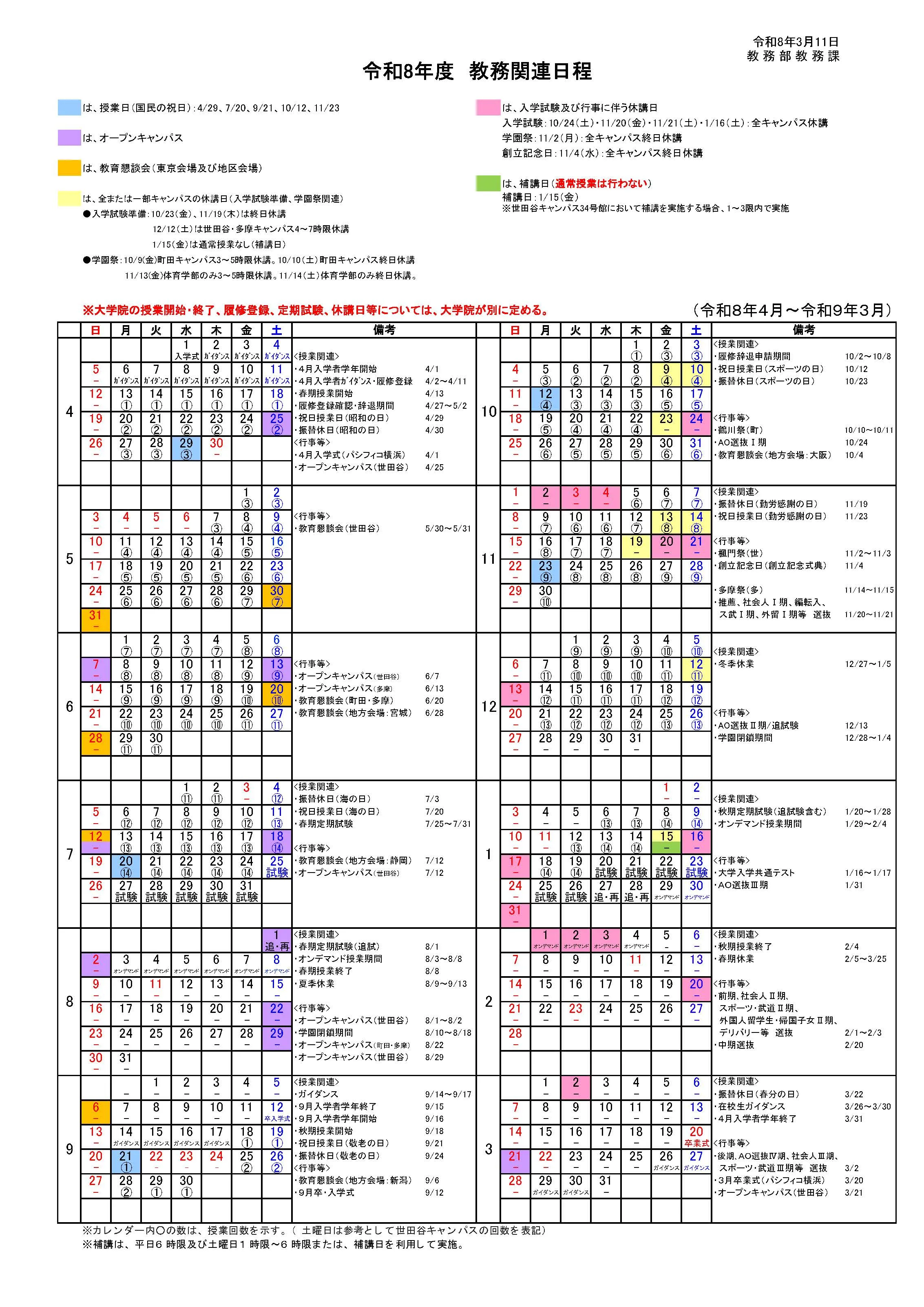 学園行事・学年歴一覧(令和8年度)