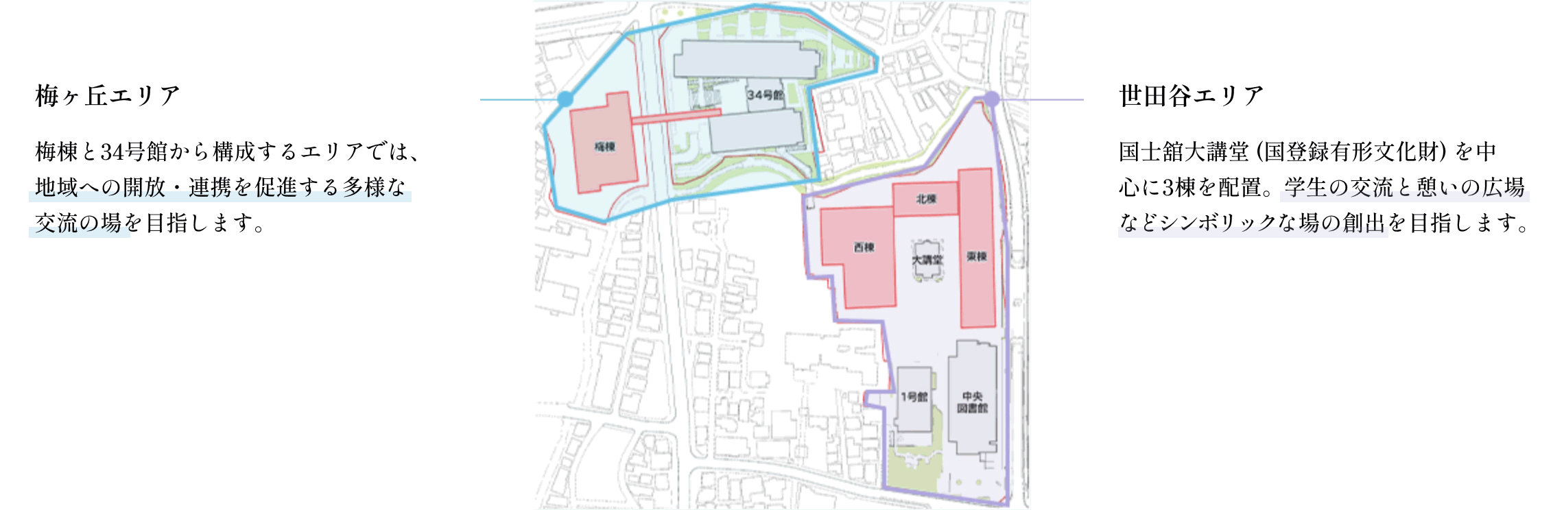 また、当キャンパスは世田谷区行政の中心に位置し、周辺には吉田松陰を祀る松陰神社、井伊大老が眠る豪徳寺、世田谷城址など優れた歴史的環境下にあり、自治体などとの良好な関係を保ちつつ意思疎通を図り、景観や眺望、防災拠点として一体の地域計画となるよう配慮して再整備するとともに、生涯学習の場・機会を通じて国士舘の教育・研究資源を還元し得る環境促進を目指します。