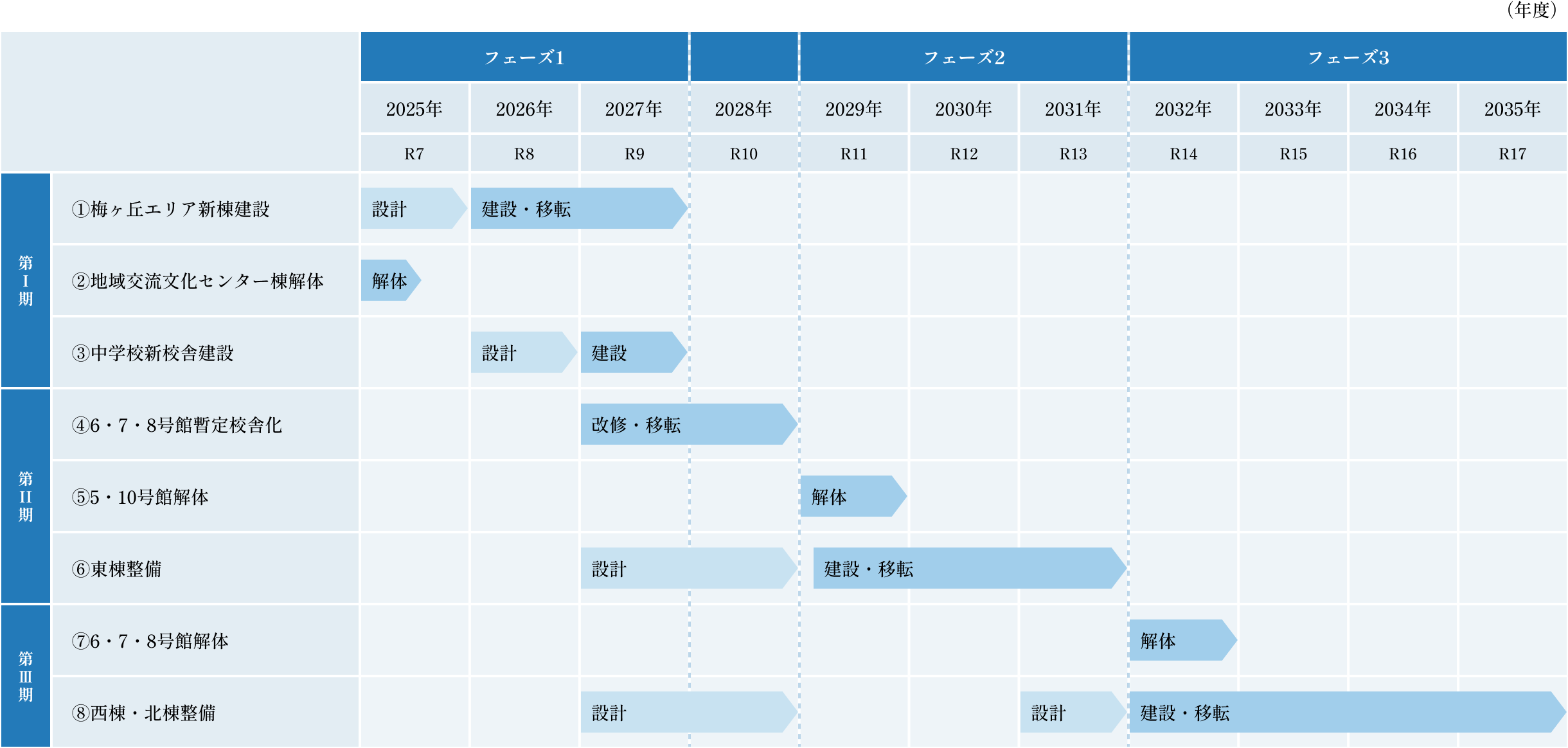 段階的に新校舎の供用を開始しながら、10年後の事業完了を目標とします。