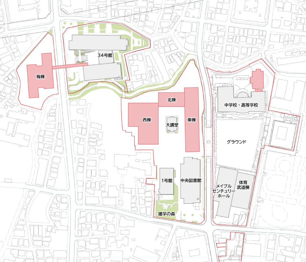 整備にあたっては、本学にある歴史的空間・建造物の保全と国士舘の理念の継承に取り組み、国登録有形文化財であり国士舘建学の精神を表徴する「国士舘大講堂」などによって醸成される象徴性を継承しながらも、次世代のニーズを満たす施設や空間を歴史の濃淡に沿って構築し、「過去・現在・未来にわたる一貫した国士舘の理念」を創出します。