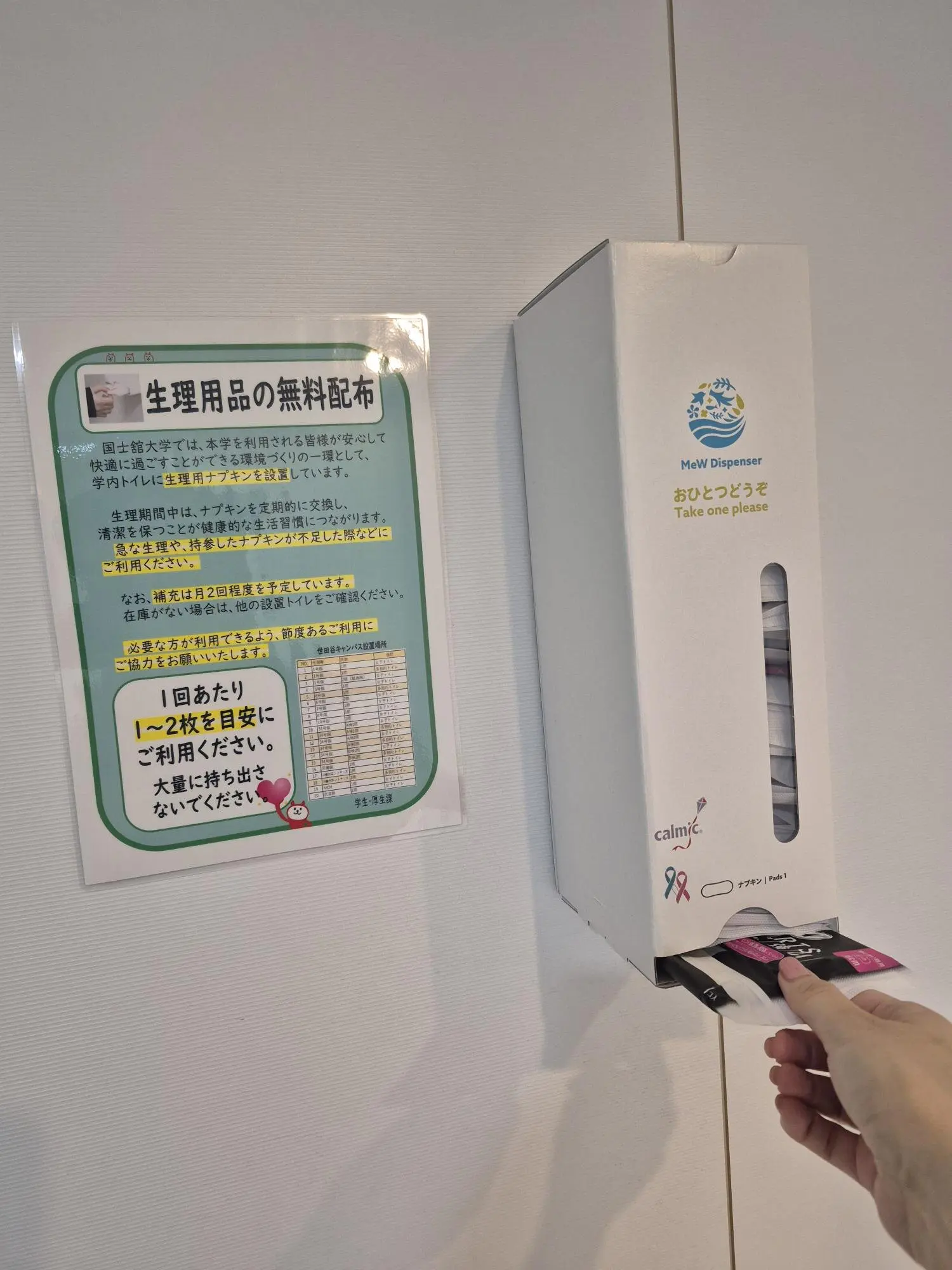 世田谷・町田・多摩・多摩南野の4キャンパスにおいて、主要号館の1階(設置がない場合は2階)の女性用トイレおよび多目的トイレの手洗い場付近に専用ディスペンサーを設置し、必要に応じてご利用いただけます。