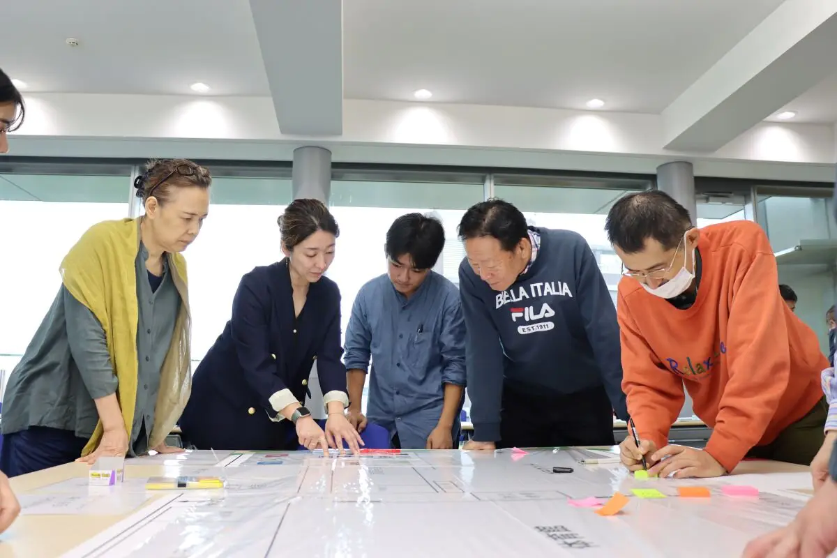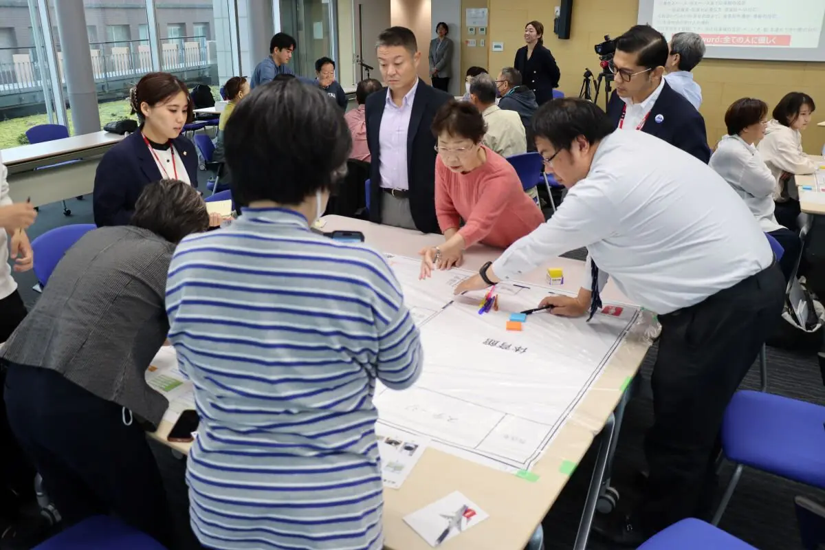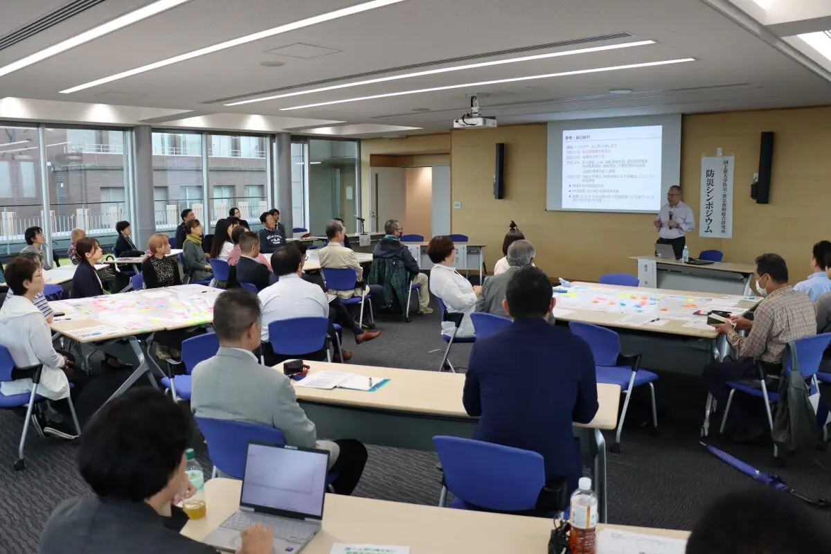 プログラムでは、はじめに、防災・救急救助総合研究所の都城治講師によるワークショップ「避難所運営ゲーム(HUG)」が行われました。参加者は図面を用いながら、災害時の避難所運営について検討。乳幼児や高齢者、ペットを連れた避難者など、多様な状況を想定し、避難スペースや物資配置などのあり方について意見交換を行い、実際の避難所運営を具体的にイメージしました。