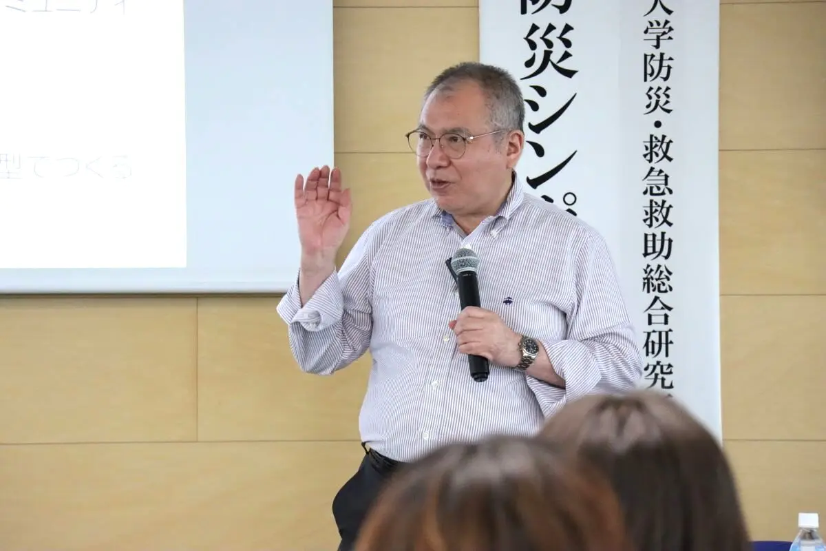 閉会のあいさつでは、防災・救急救助総合研究所の田中秀治副所長が、国士舘大学として地域の避難支援にどのように貢献できるかを検討し、避難所指定に限らず受け入れ体制を整備していることを紹介。「災害は必ず来るという前提に立ち、日頃から地域との連携と訓練を継続することが大切であり、今後も大学と地域が手を取り合って防災に取り組んでいきたい」と述べ、シンポジウムを締めくくりました。