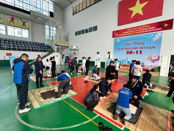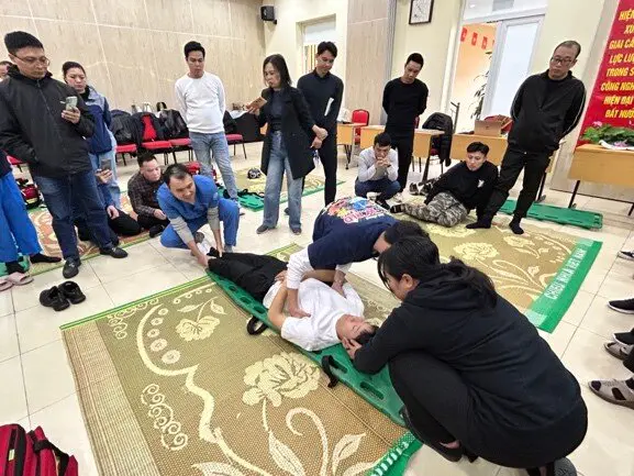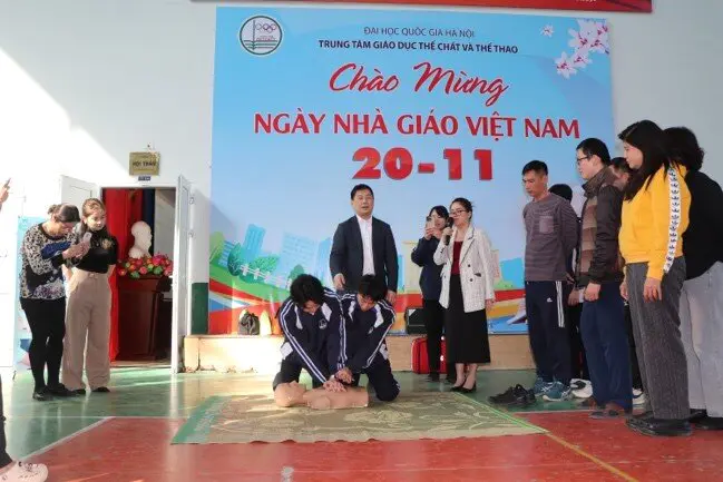 厚生労働省が所管する医療技術等国際展開推進事業の⼀環として、11月18日から23日にかけて、防災・救急救助総合研究所石﨑貴准教授、救急システム研究科柳聖美研究科助手、木村龍さん(博士課程1年)および板垣和真さん(修士課程1年)がベトナムの⾸都ハノイに招請され、ベトナム国家⼤学医科薬科⼤学に設置予定の救急救命⼠学科の教員となる現地医師を対象とした指導者研修とベトナム国家⼤学の教員に対する応急⼿当講習を実施しました。