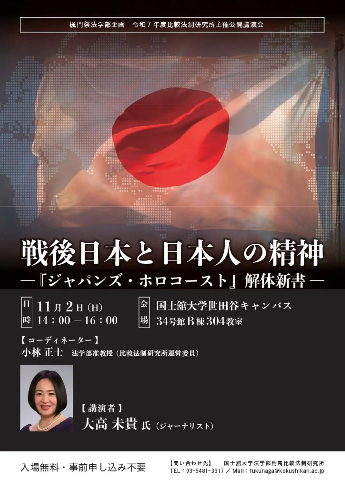 本講演会は、ジャーナリストの大高未貴(おおたか みき)氏に、御自身の著書「『ジャパンズ・ホロコースト解体新書』(ビジネス社、2024年)」の内容について講演をしていただきます。2024年3月にアメリカで発行された『ジャパンズ・ホロコースト』では、日本が1927年から1945年まで3000万人のアジア人を虐殺するというホロコーストを行ったと主張されています。講演者の大高氏は、この本が主張する「日本によるアジア人ホロコースト」を裏付ける資料がないことを指摘し検証しています。本講演では、それらを踏まえて御自身の著書の内容を分かりやすく解説していただく予定です。