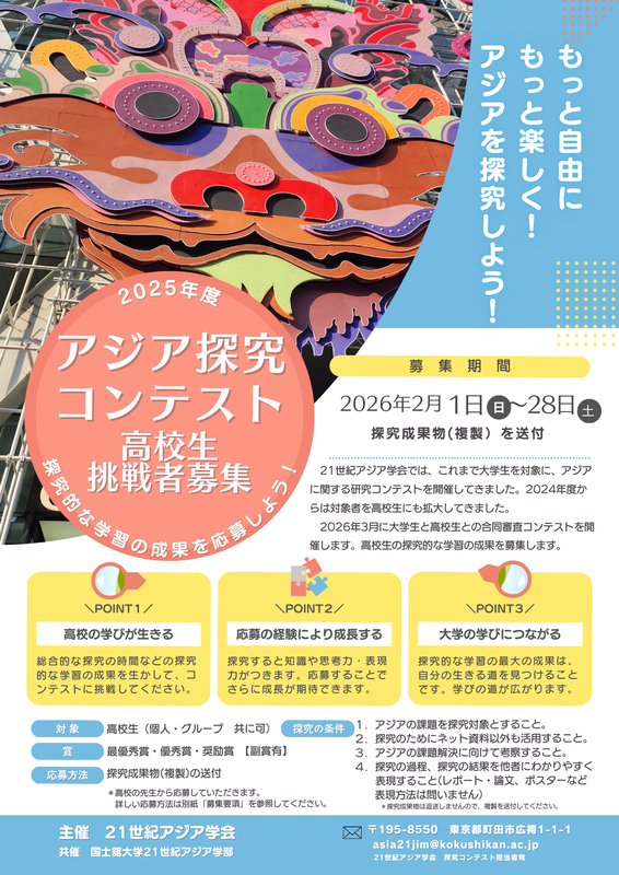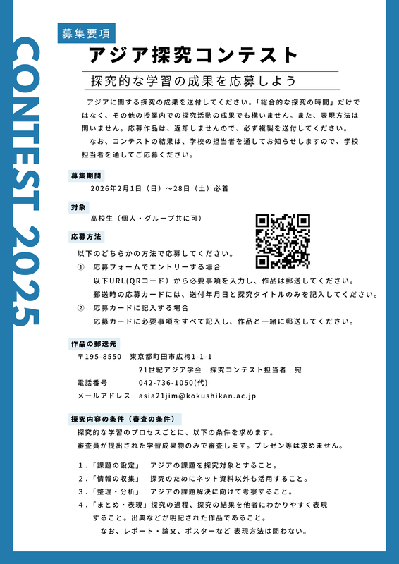 21世紀アジア学会では、高校生を対象に「アジア探究コンテスト」を実施します。高校生が探究した成果物を募集し、厳正な審査のうえ「最優秀賞」「優秀賞」「奨励賞」を授与いたします。