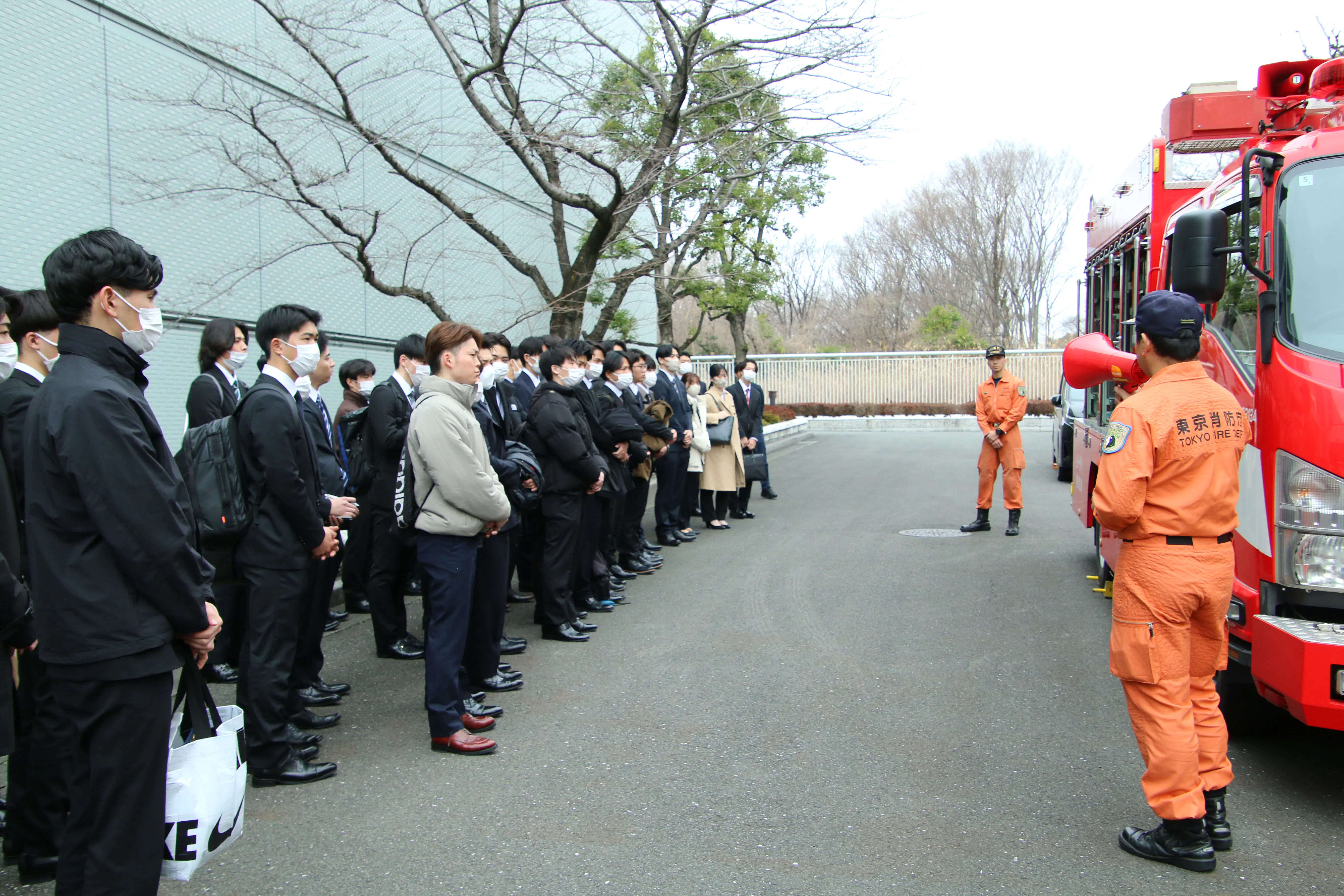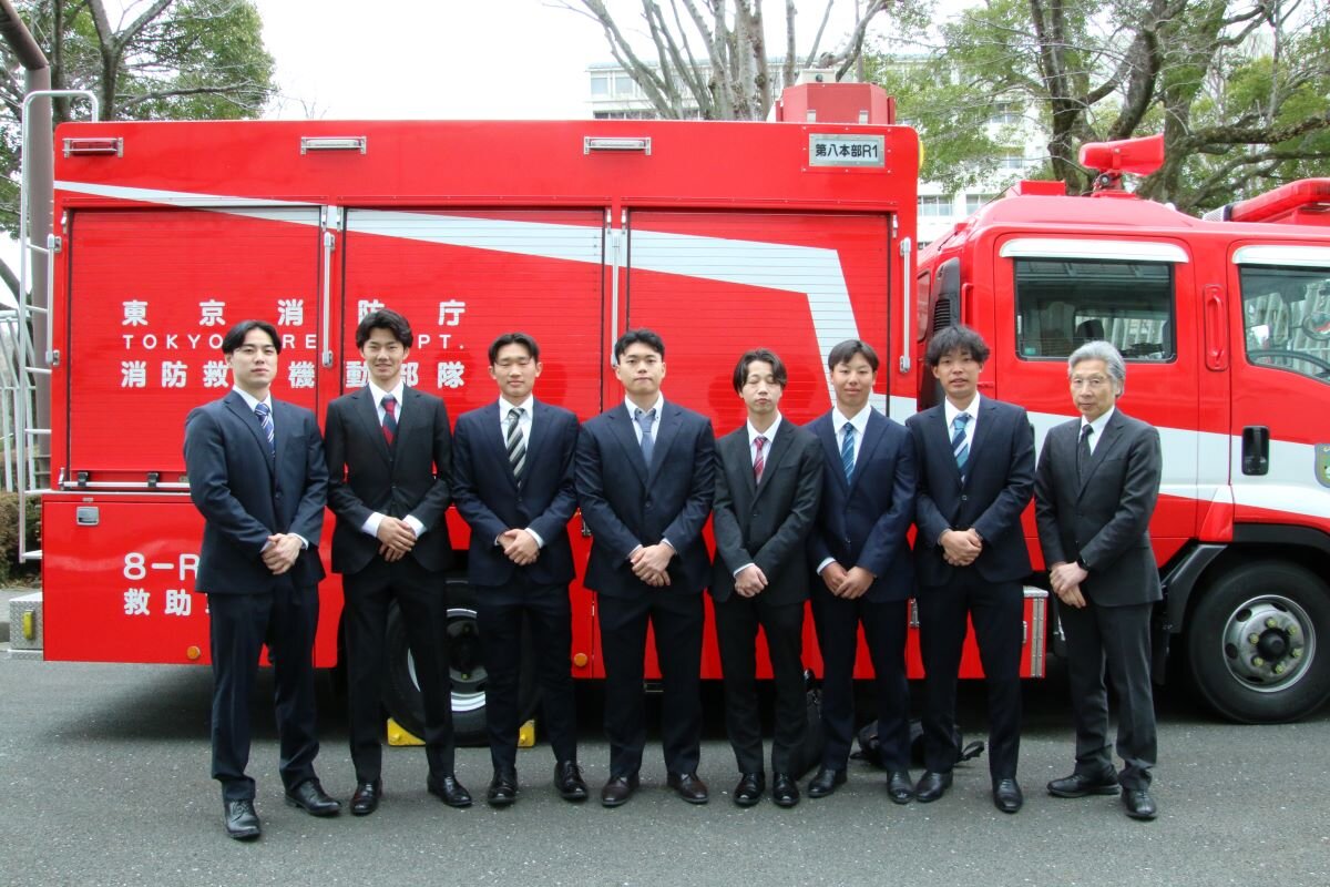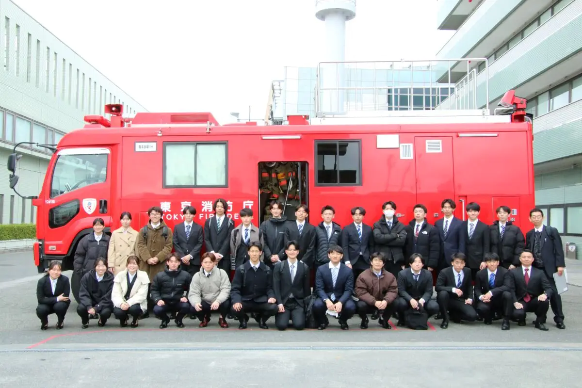 法学部の竹内栄一ゼミに所属する学生7人と、体育学部スポーツ医科学科の学生約150人が3月6日、東京都立川市にある東京消防庁立川消防署、第八方面消防救助機動部隊、多摩指令室、警防部多摩指揮隊を見学しました。