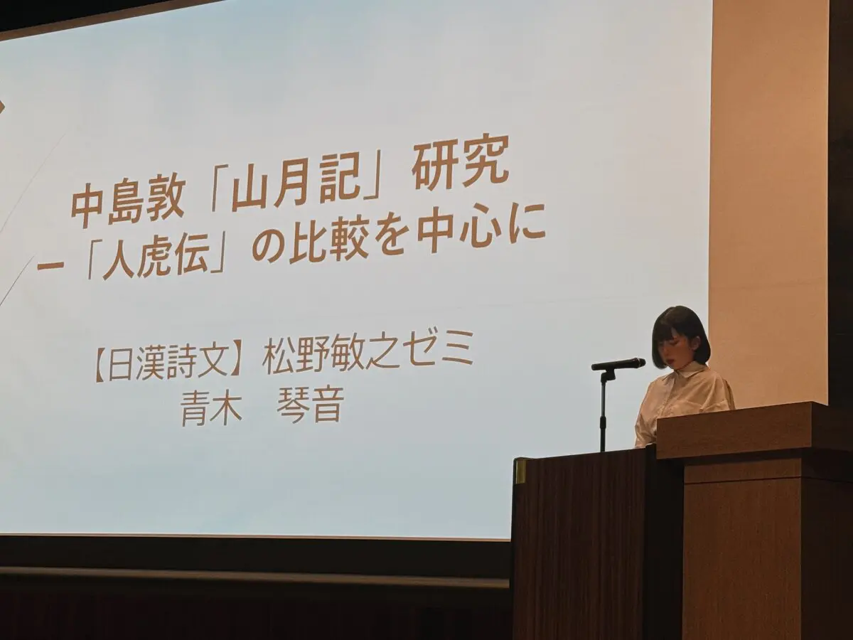 まず、卒業論文の中間発表が行われ、現在、4年生が在籍している11のゼミ(文学系:中古・中世・近世・近代1・近代2・日漢詩文、日本語系:日本語・教育表現、文化系:映像比較・日本思想・現代文化)から選出された4年生が、自身の卒業論文について15分間の持ち時間で発表しました。発表の後には、会場から質問があり、活発な質疑応答が行われました。