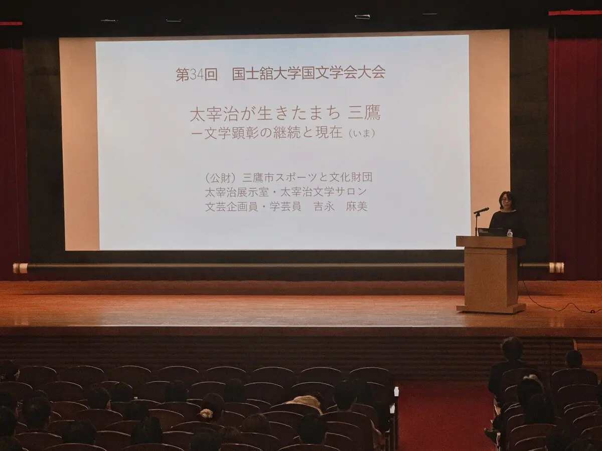 続いて外部から招待した講師による講演が行われました。講演に来ていただいたのは、三鷹市学芸員主査 吉永麻美氏で「太宰治が生きたまち 三鷹 ―― 文学顕彰の継続と現在(いま)」というテーマでお話をしていただきました。