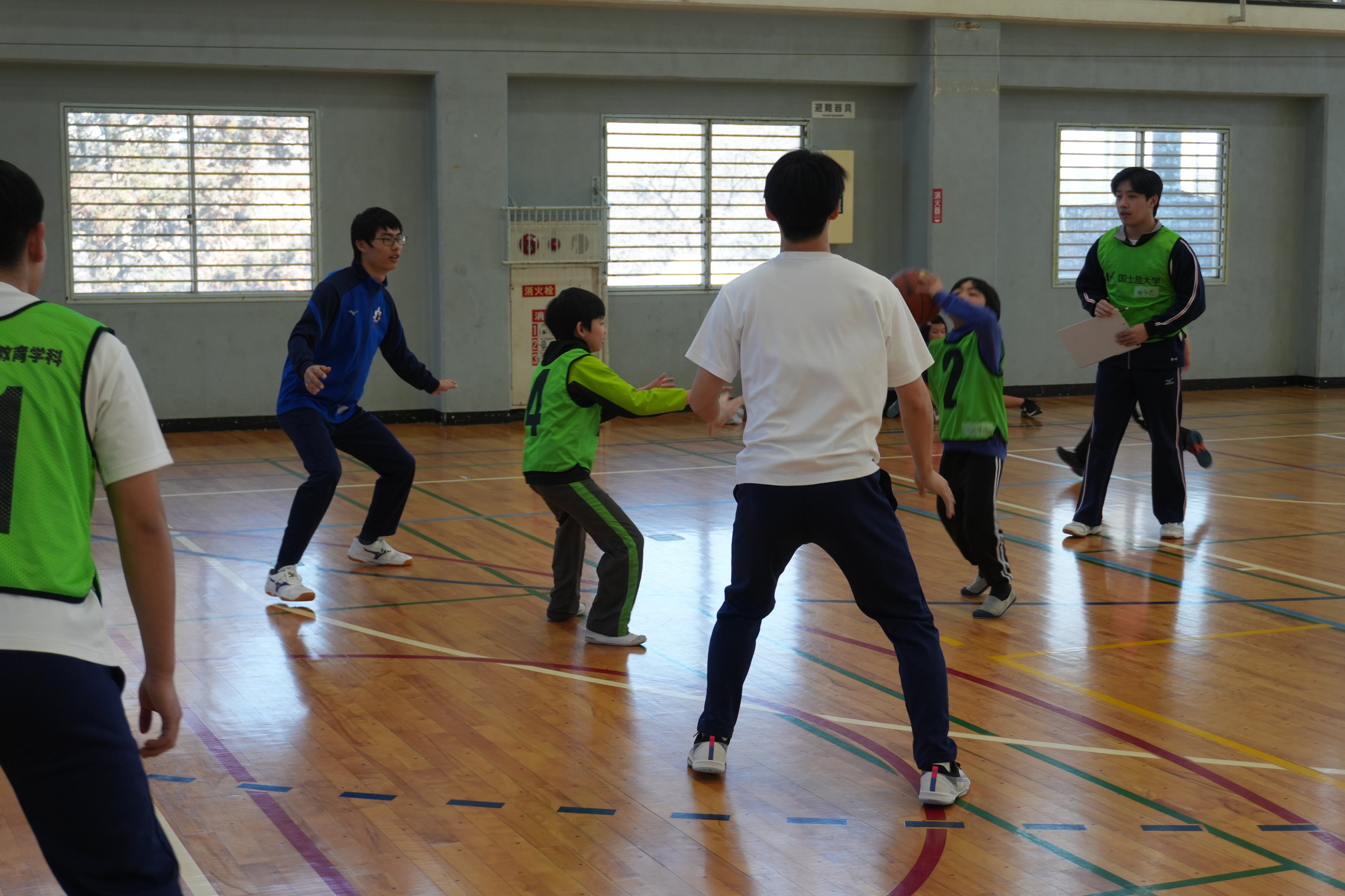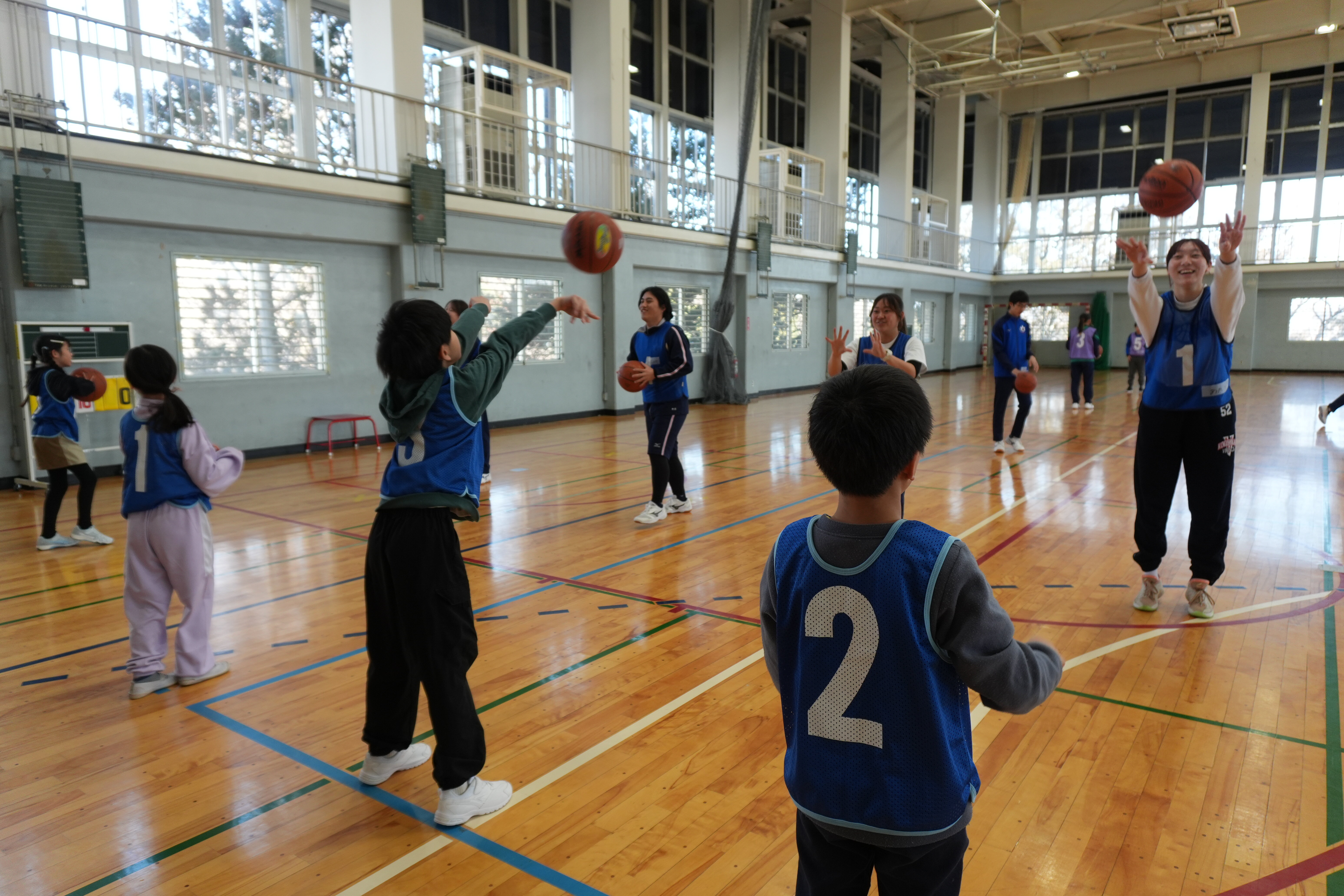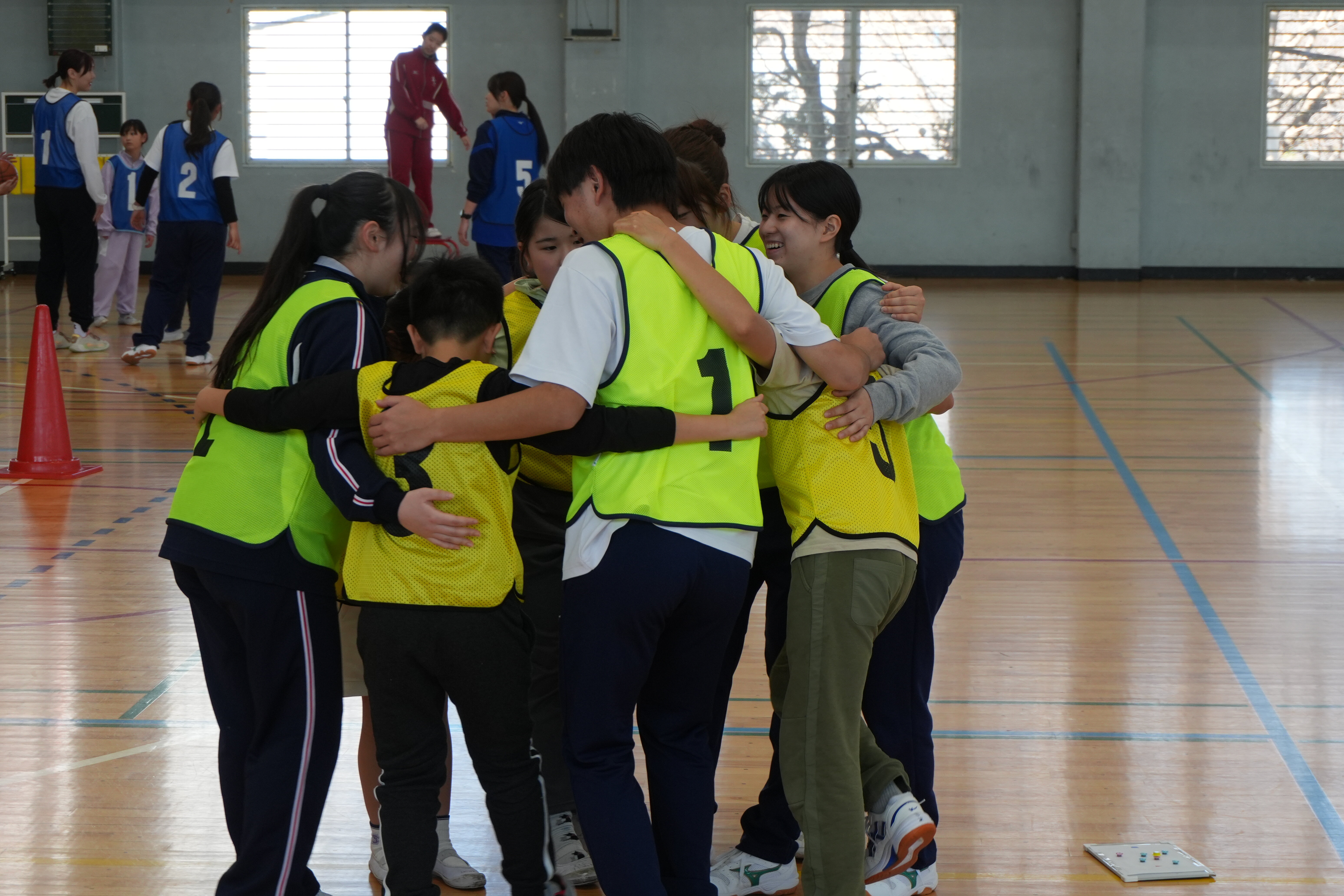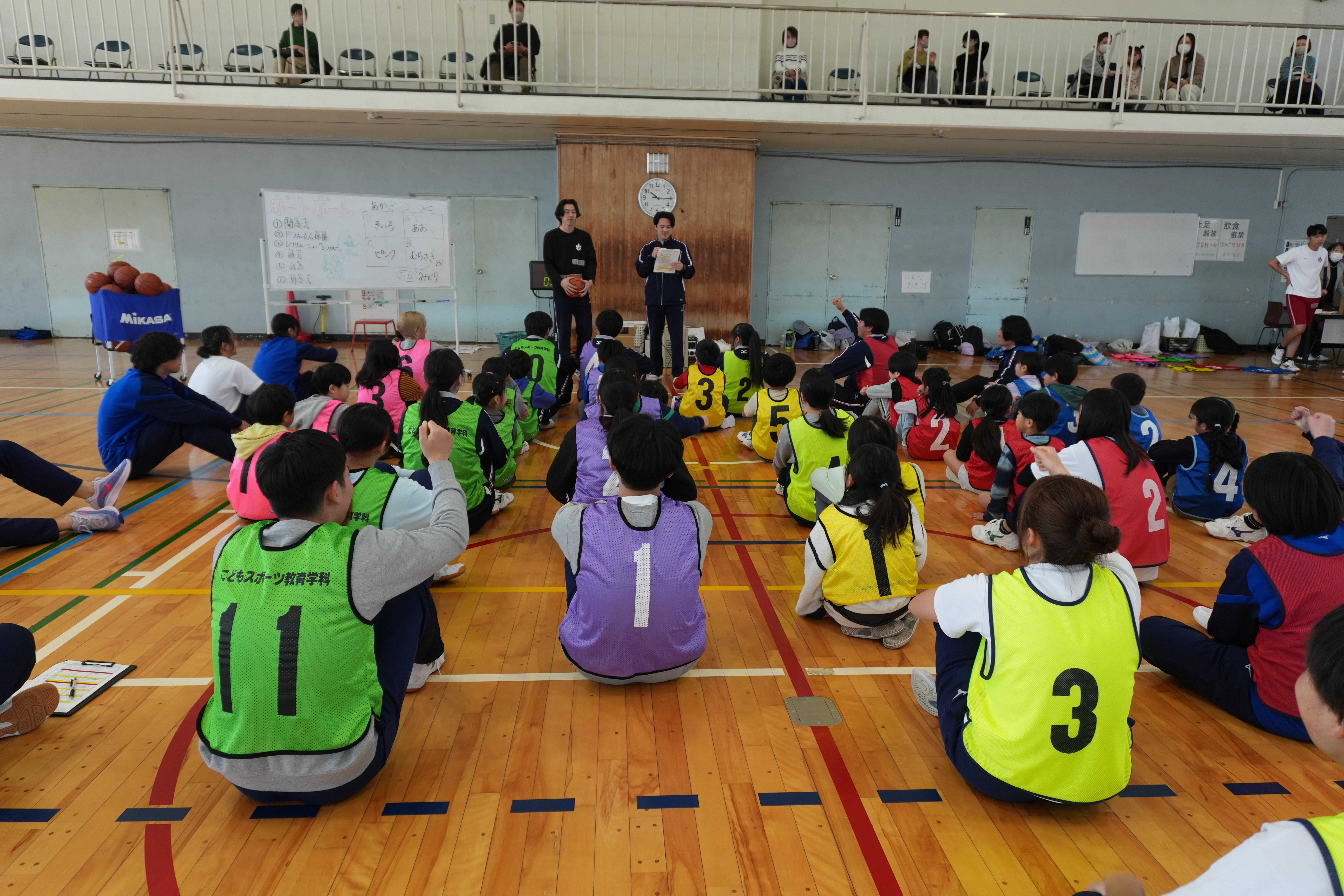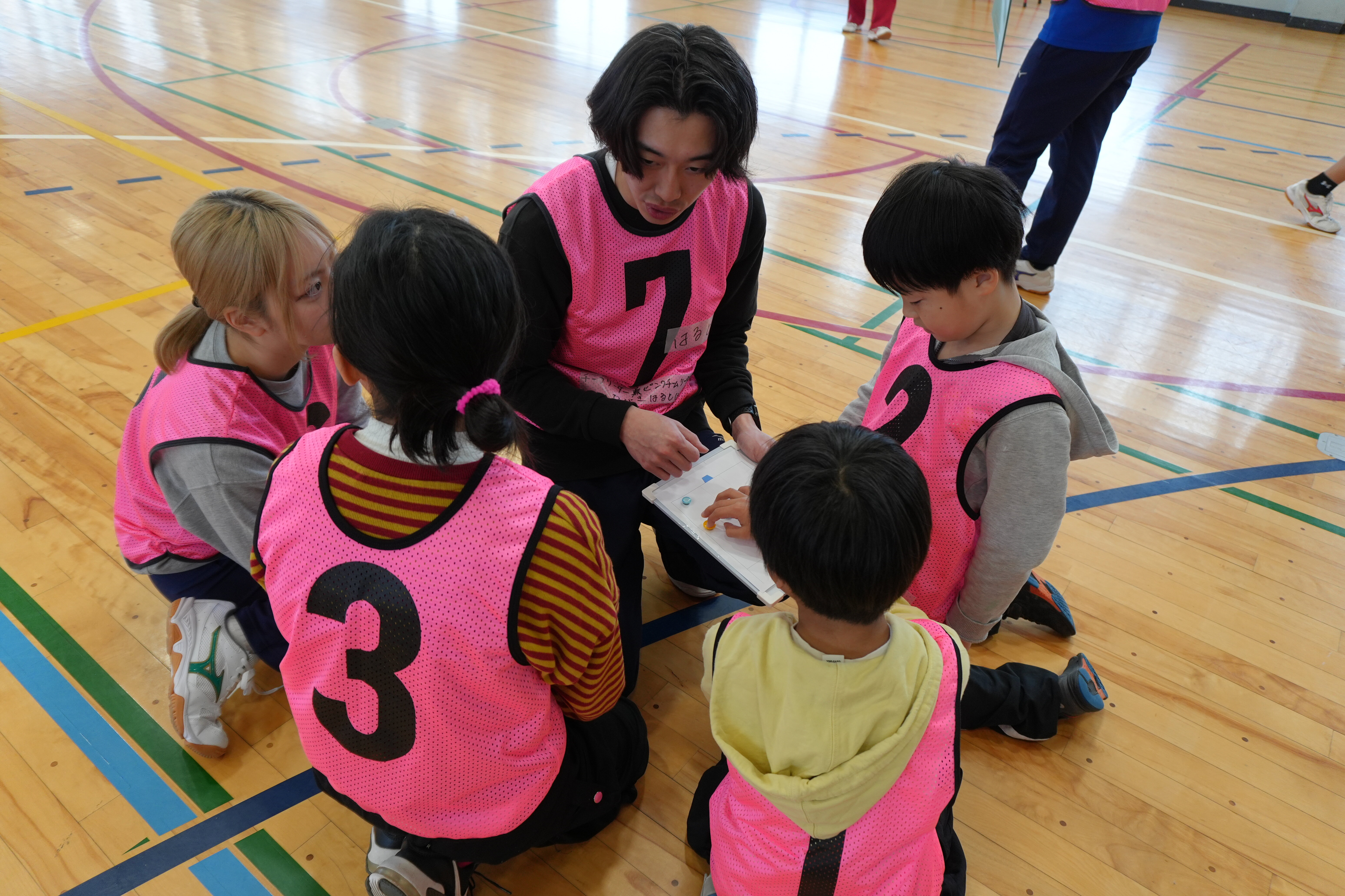 今回のテーマは「ポートボール」。参加した小学生たちは大学生と一緒にルールや基本動作の確認、パス練習などをしたあと、試合に臨みました。試合前には作戦ボードを使って戦略を立てたり、円陣を組んで気合を入れたりしていました。
