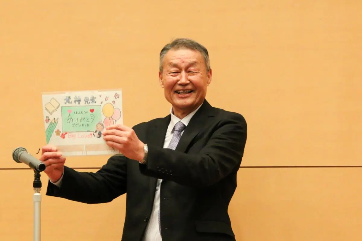 北神教授は、45年の研究者としての歩みを振り返りながら、現代の教育状況を「不安・不信・不満」が渦巻く時代と位置づけ、「安心・信頼・満足」を軸にした地道な努力が、困難な状況を乗り越える道筋であると次世代へ力強く語りかけました。