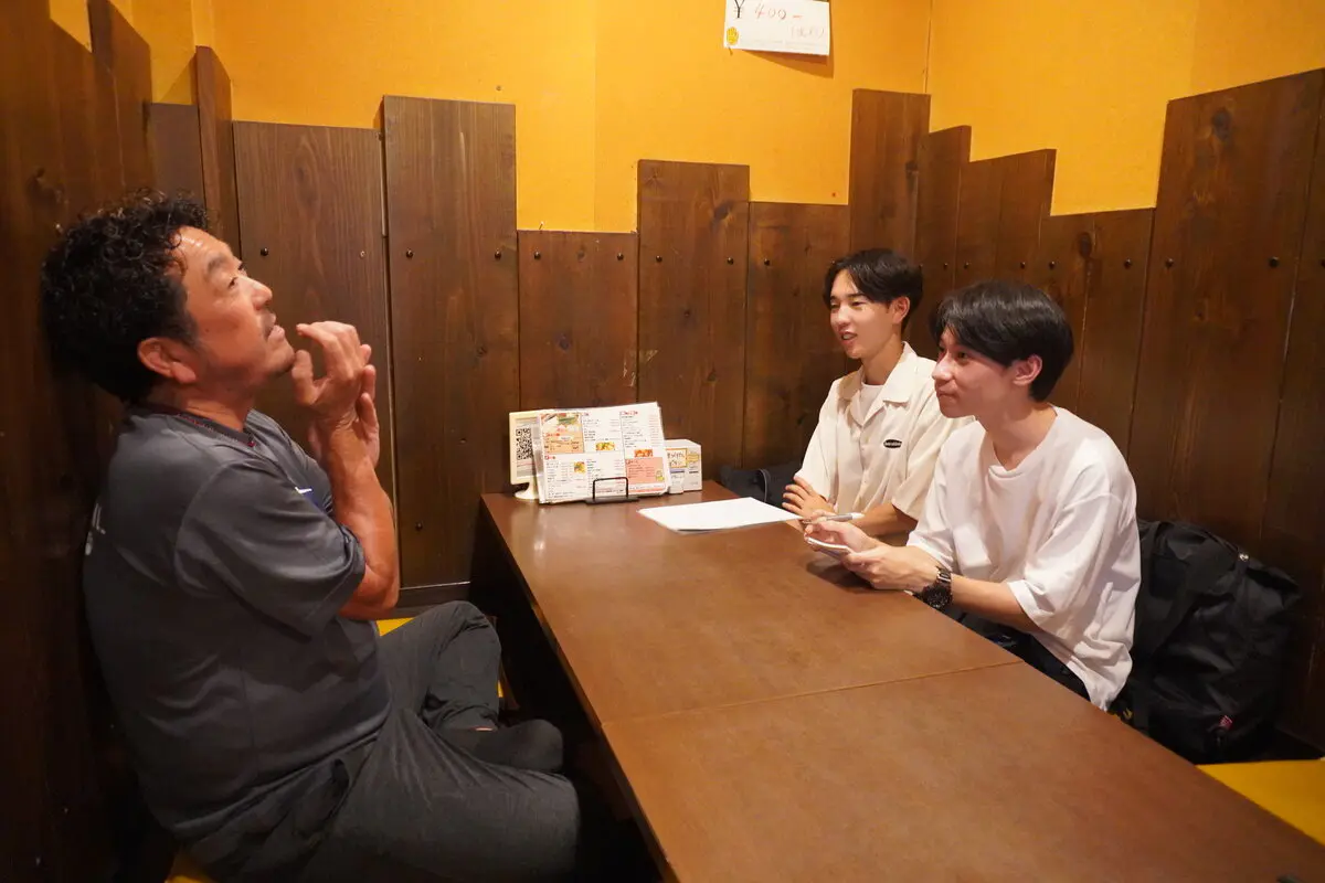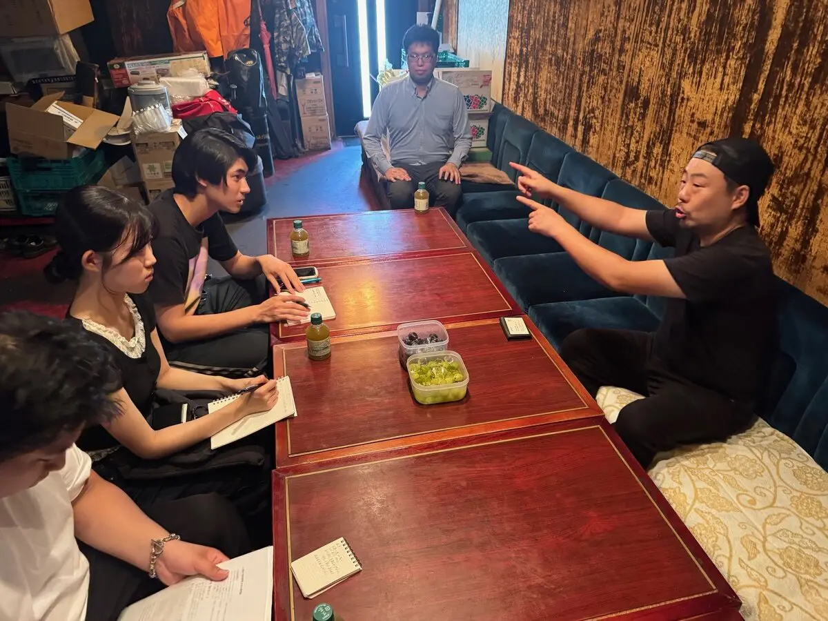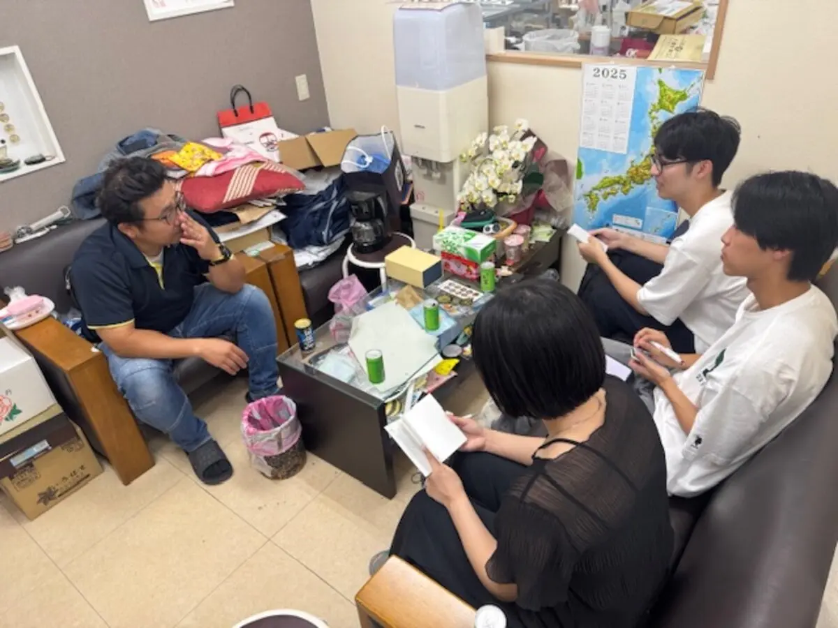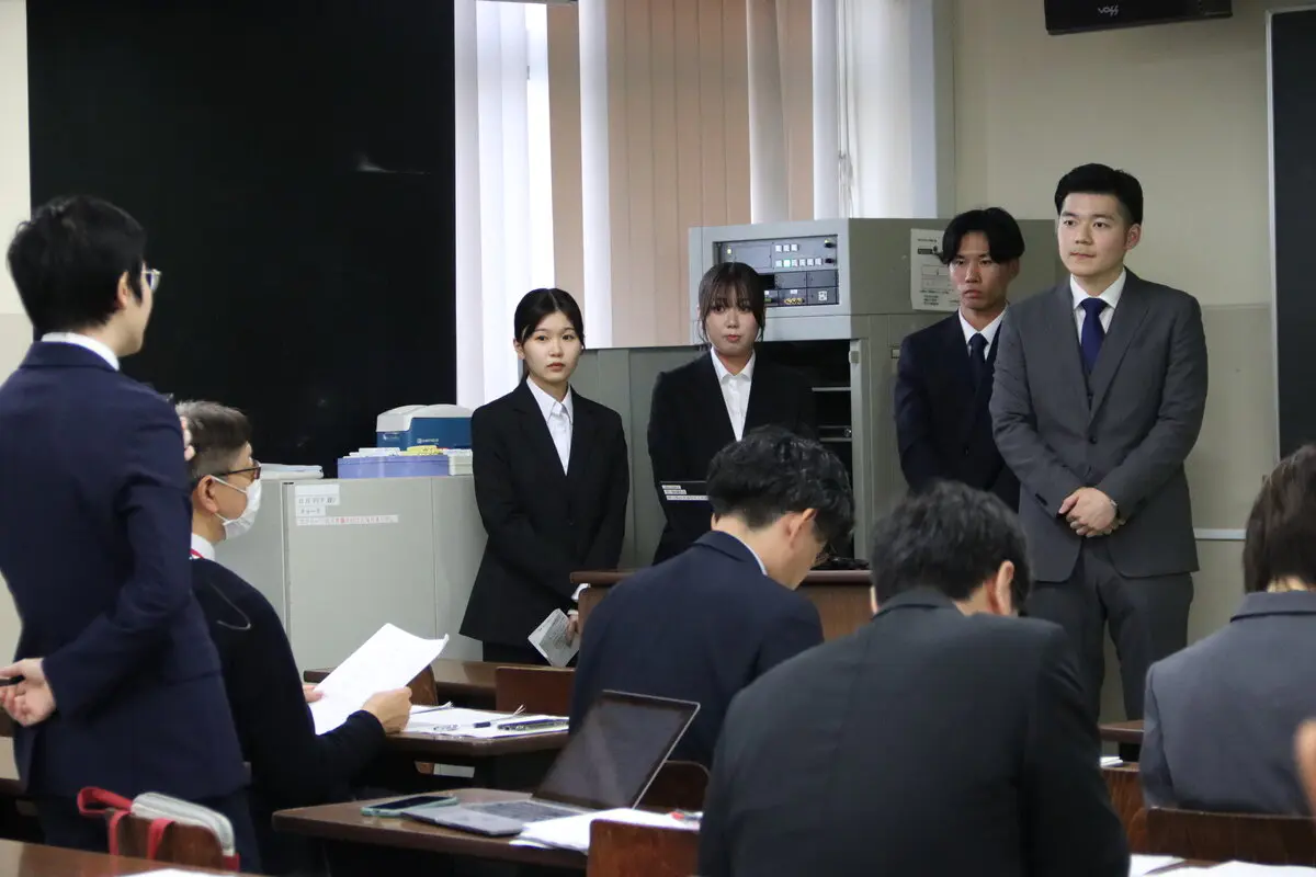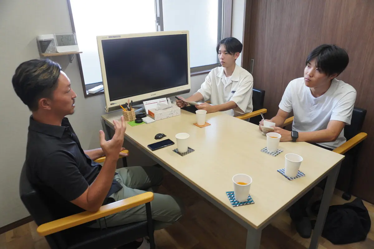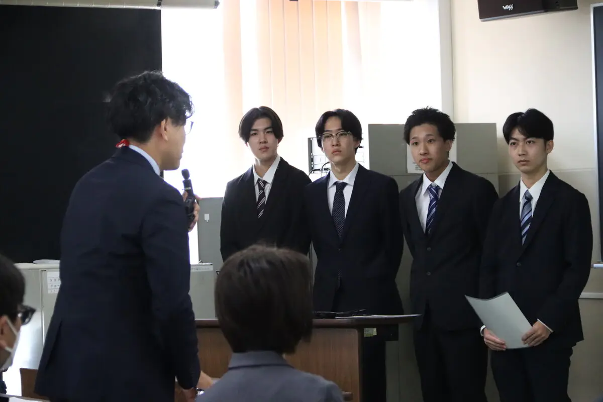 八潮市商工会青年部の定例会日だった当日は、初めに通常の定例会が行われ、学生らはこれを見学しました。参加した学生たちは、八潮市や八潮市商工会青年部についての知識や理解を深めるため、青年部員の報告に聞き入っていました。