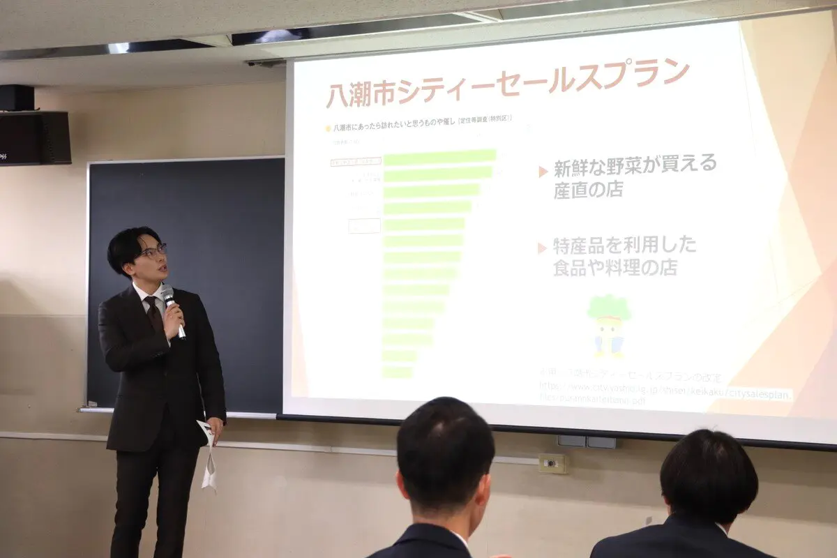 今回のプレゼンテーションテーマは「地方自治と地場産業」です。参加した学生らは、10月の中間発表に向けて、地域の商工会やさまざまな団体と連携しながら八潮市の地場産業を調査します。それらの調査をもとに、地域資源を活用することによる地域経済の活性化に資する提案や、八潮市だけではなくほかの地域でも広く通用するような活性化モデルの提案などを考えていきます。