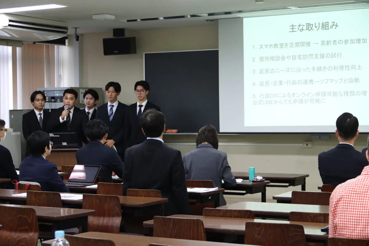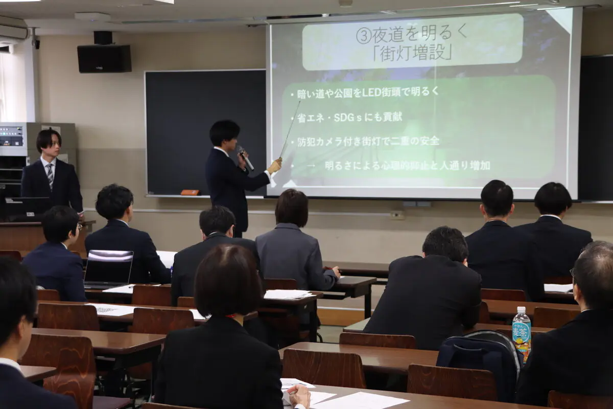 各チームからは、八潮市の名産品である野菜を生かした政策やこどもをターゲットにして地場産業を未来につなげるための政策、各行政からの視点の政策などそれぞれのチームが一丸となり独自性に富んだ発表を行いました。審査員を務めた教員からは「学生ならではの新たな視点からの政策で非常によかった」「実地調査の内容を踏まえデータがうまくまとめられていた」「ほかチームの発表からも学び、政策をよりよいものにブラッシュアップしてほしい」などのコメントが述べられ、学生や教員にとって政経学部としてのつながりを深める機会となりました。