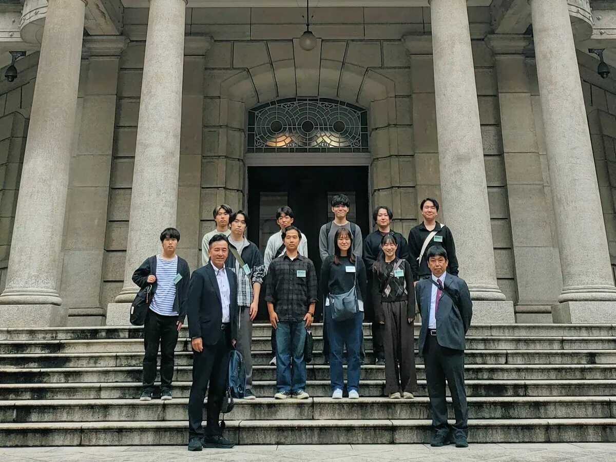 10月15日、政経学部の教職免許取得を目指す学生10人が、「教職実践演習(中・高)」の一環として、東京都中央区にある日本銀行本店・貨幣博物館・東京証券取引所を訪問しました。現場での体験を通じて、社会科教育に必要な経済・金融分野の理解を深めることを目的としたプログラムです。