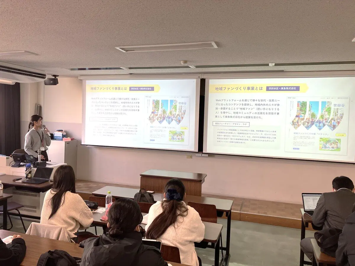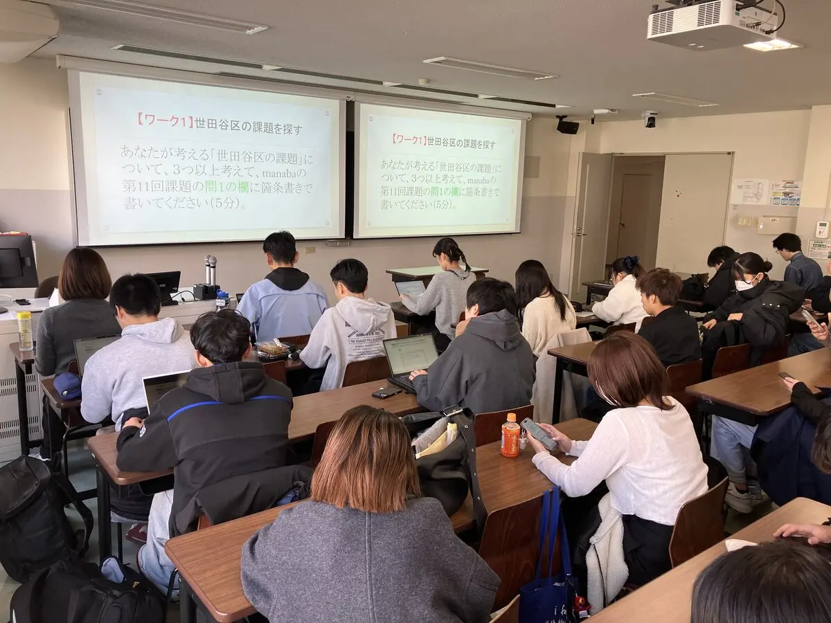 12月18日、政経学部政治行政学科の「地方分権論」の講義において、世田谷区が推進する市民参加の新しいプラットフォーム「ツクリテ」を題材に、約70人の学生たちが意見を交わしました。