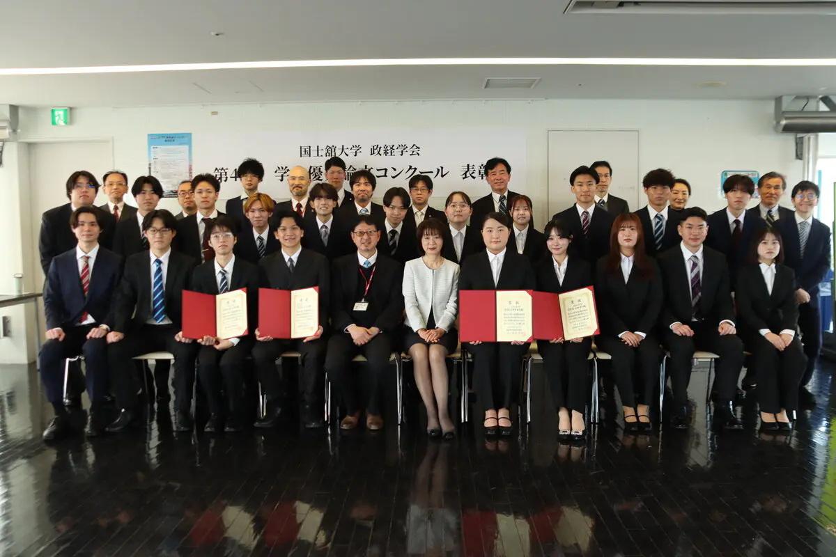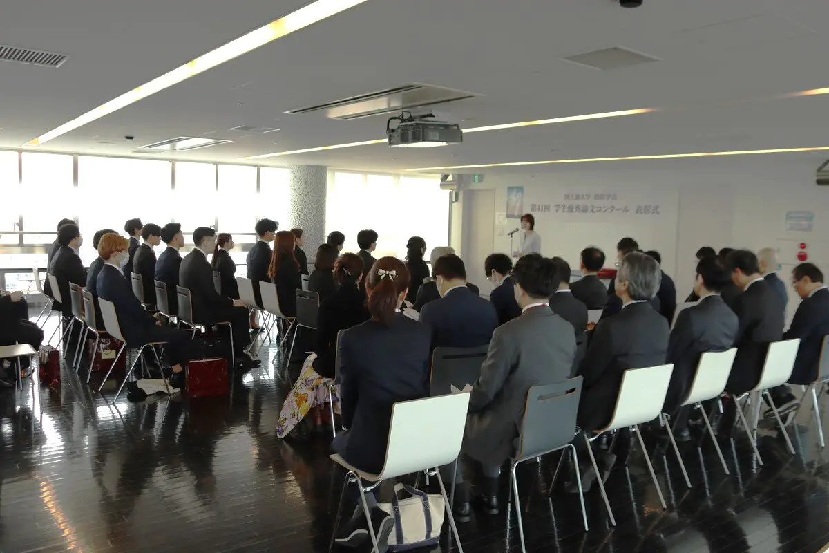 3月19日、第41回学生優秀論文コンクール表彰式を、34号館10階スカイラウンジで実施し、受賞者した学生と指導教員を含む政経学部の教員らが参加しました。