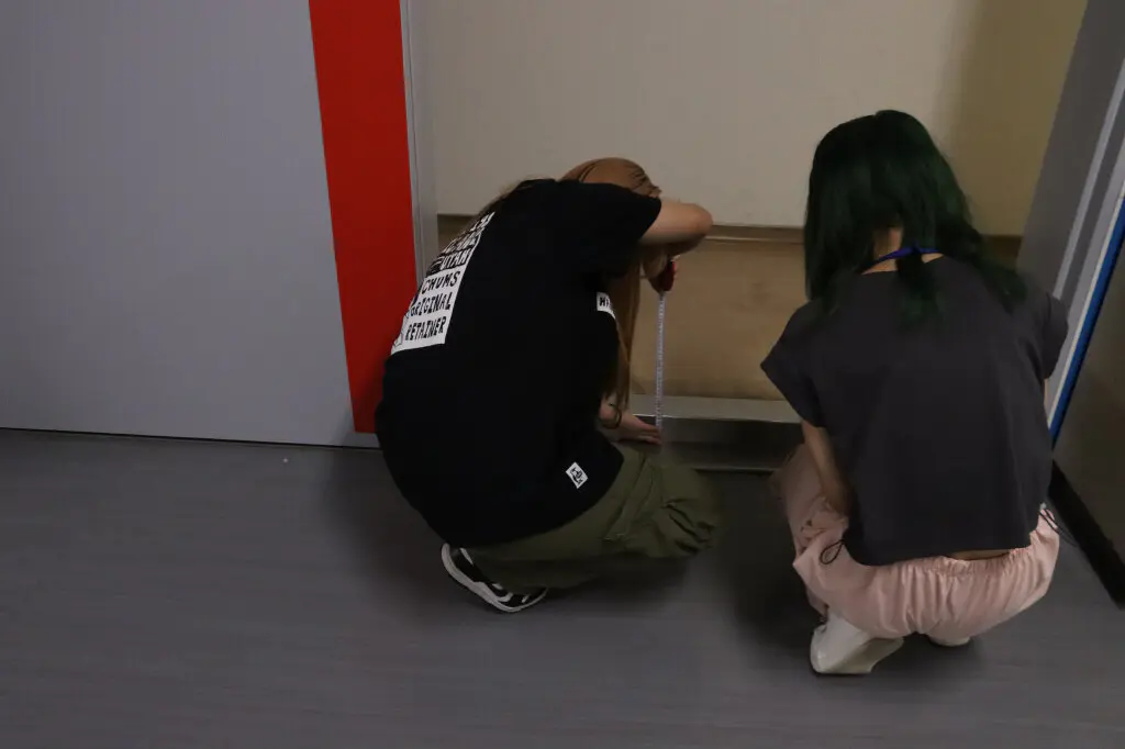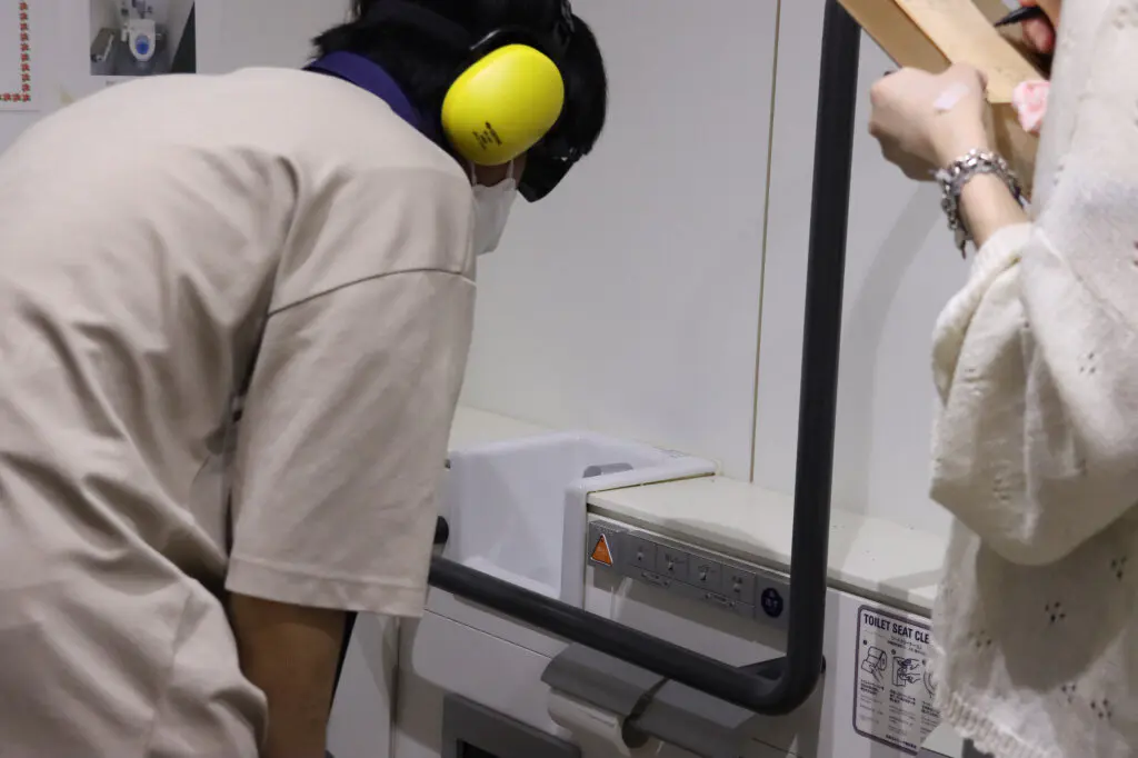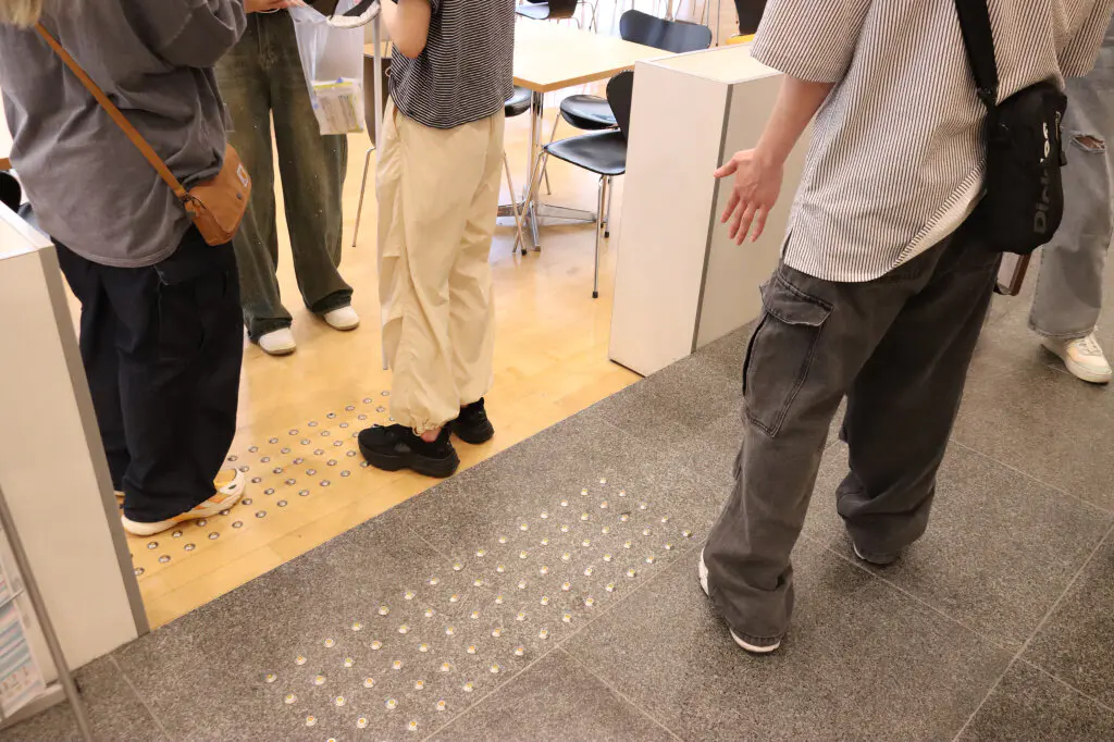 当日は10グループに分かれ、車いす利用者(頸椎損傷)、視覚障がい者(全盲)、高齢者の3つの疑似体験装具を身につけて学内を回りました。介助者、記録者、計測者などの役割も決め、各建物の出入口や多目的トイレを中心に、階段の段差や踊り場の幅、手すりの高さなどを計測したり、体験した感想を話したりしながら進みました。学生らは「白杖を持っていない側の空間に不安を感じる」「ゴーグルを通してみると視界が悪く、スポットライトが極端に眩しく感じることがわかった」などの感想を口にしていました。田中千歳研究室・寺内義典研究室の学生がキャンパスの各チェックポイントに立ち、「床の色が違うことで段差があることがわかるように工夫されている」「手すりが階段中央にあるのは半身まひの人には有効」「多目的トイレがアクセスしやすいフロアに設置されているか」など、調査、計測のポイントを助言しました。
