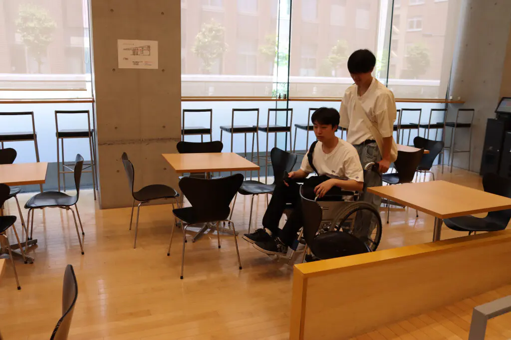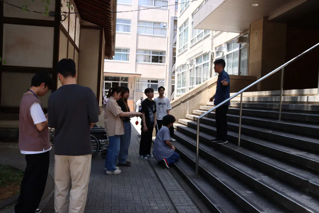 理工学部建築学系1年生の必修科目「建築基礎演習」で6月8日、学内ハンディキャップ体験を実施しました。本科目は建築学系の初年次教育であり、全15回のうち2回の授業(3・4限)を使って、本学系3コースの一つである建築福祉・医療コースに関する理解を深めることを目的に毎年実施しています。3年次履修科目「建築と人間工学」も兼ねており、履修する3年生がグループをまとめました。普段生活するキャンパス内を歩き、障がいのある当事者への理解を深めながら物理的なバリアの存在とその解消法について考える機会としています。