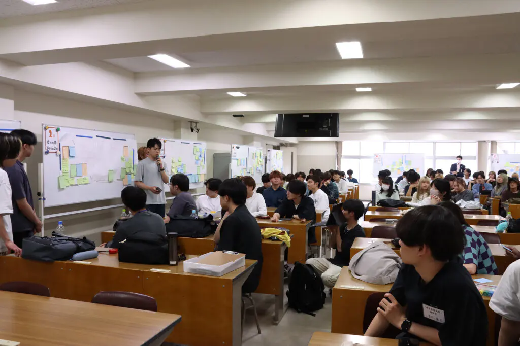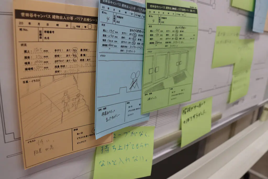点検後に教室に戻った学生らは、校舎マップを広げ気づいた点をまとめる作業を行い、最後には各グループの発表が行われました。学生からは「利便性のためのマットが他の人のバリアになっていることに気づき、誰にとっても使いやすい方法を実現することの難しさを感じた」「人の助けを借りずに動くことができる施設づくり、仕組みづくりが重要」など、体験を通して得られた感想や各建物の使いやすさ、気づいた課題など建築の視点からさまざまな意見が出されました。