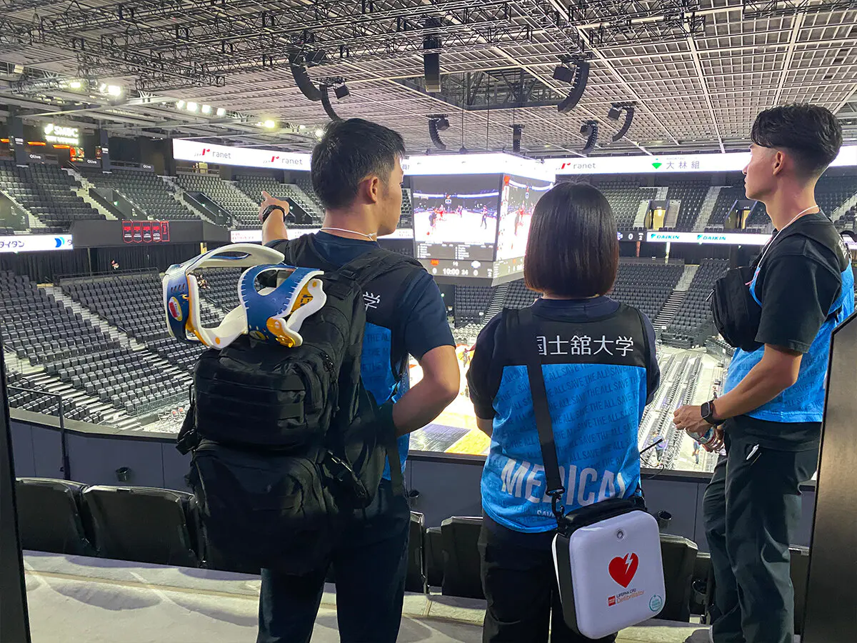 キャンパス内での部活動中(課外活動中)の事故・怪我等に対応するため、地域医療機関の協力体制の下、学内(多摩キャンパス)で救急救命士の常駐によるメディカルサポート体制を構築し、受傷した学生アスリートの救命及び症状 の悪化軽減(早期競技復帰)を図っています。また、キャンパス内で開催される試合において、救護活動やAT関連のサポートを行い、安全・安心かつ充実した試合が開催できるようサポートしています。
