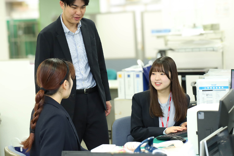 私が所属する入試部入学課には、入試の実施と学生募集という大きく二つの業務があります。私はその中でも主に、学生募集に関わる仕事を担当しています。学生募集では、受験生からの質問や進路相談に応じる機会が多く、高校での進路ガイダンスや、全国で開催される受験生対象の個別相談会など、キャンパスの外で活動する場面がよくあります。相談に訪れる受験生は、将来への不安や進路の悩みを抱えていることが多いため、「相談してよかった」と思ってもらえるように、少しでも進路選びの助けになれる存在でありたいという思いで日々取り組んでいます。また、年齢が近いからこそ共感しやすい部分もある一方で、新たな視点に気づかされることも多く、私自身の学びにもつながっています。受験生一人ひとりに寄り添えるよう、大学の制度や特徴を理解することに加え、どのように伝えればより届くのか、話し方や説明の工夫も心がけています。