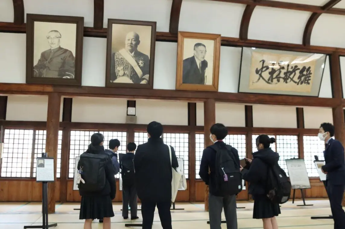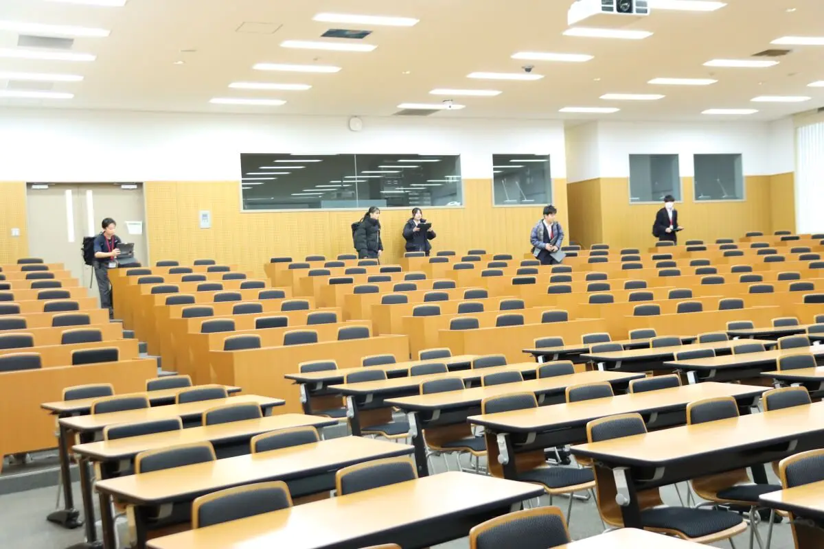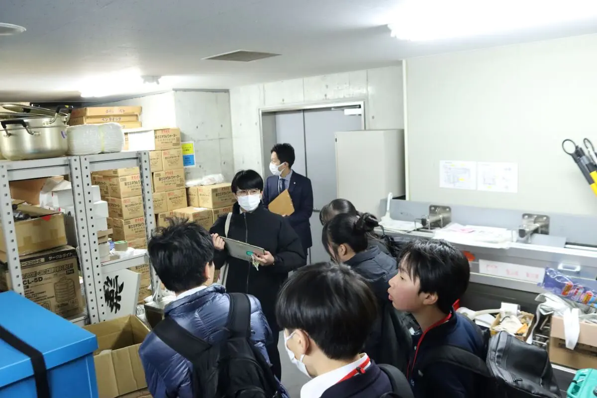 続いて、フィットネスセンター、国士舘大講堂、34号館スカイラウンジ・B301教室・防災倉庫などを、説明を交えながら案内しました。中学生らは、事後学習で施設PR動画の作成やプレゼンテーションを行う準備として、各施設を興味深く見学しながら写真や動画に記録しました。特に大講堂では、戦火を逃れた経緯について熱心に話を聞き、質問する様子がみられました。また、B301教室の規模の大きさや防災倉庫の豊富な格納品を見て、大学の教育環境や防火対策についての理解を深めました。