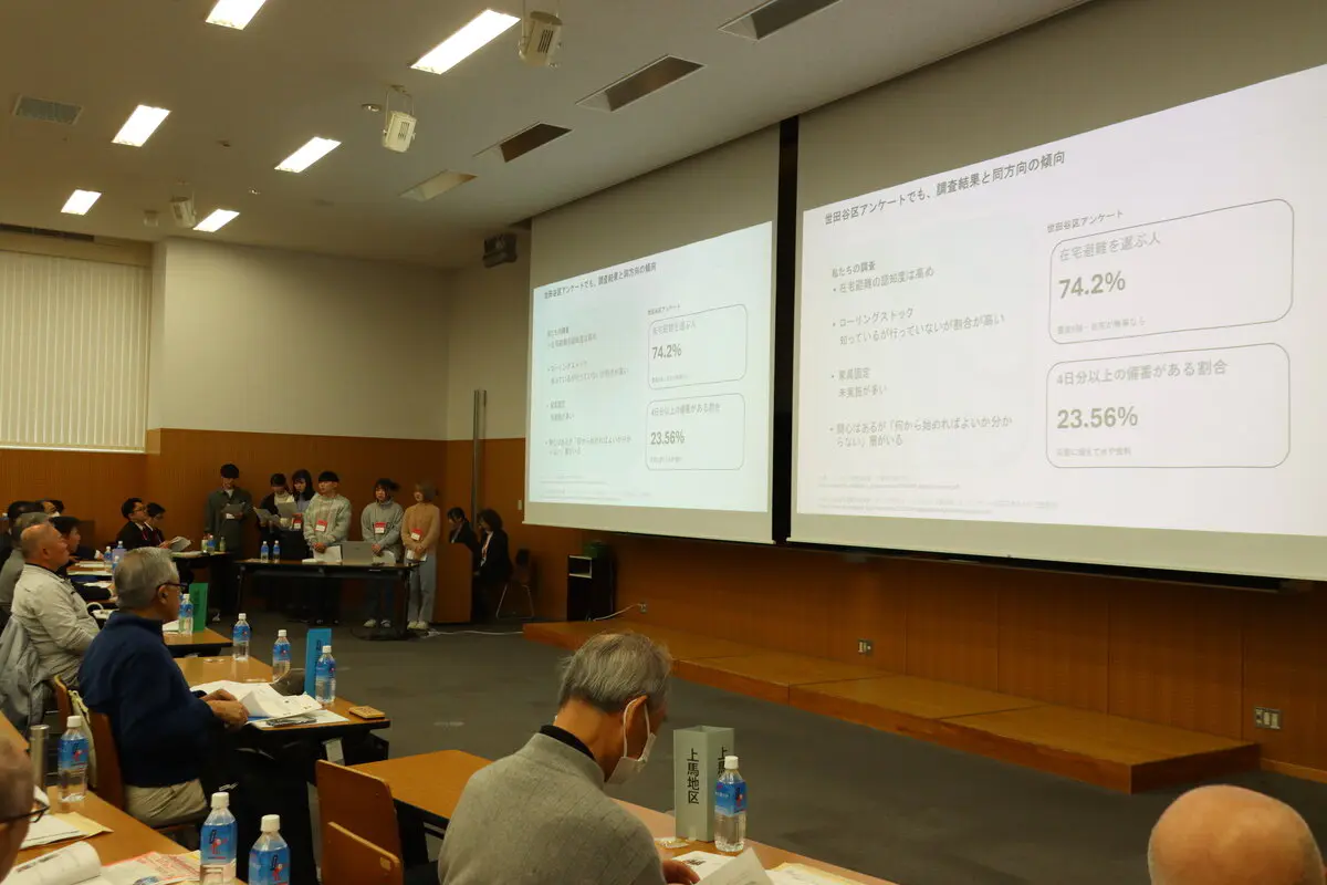 本学からは防災チームと防犯チームに分かれて、「若林・三軒茶屋地区におけるローリングストックの普及状況~防災イベント参加者へのアンケート分析~」「地域住民と大学生による持続可能なパトロールについて~『効率化』と『活性化』から見えた、継続への土台作り~」というテーマでそれぞれ発表し、地域でのつながりの希薄化といった防災面での課題や防犯力向上のための地域活動活発化に向けた提案などを行いました。