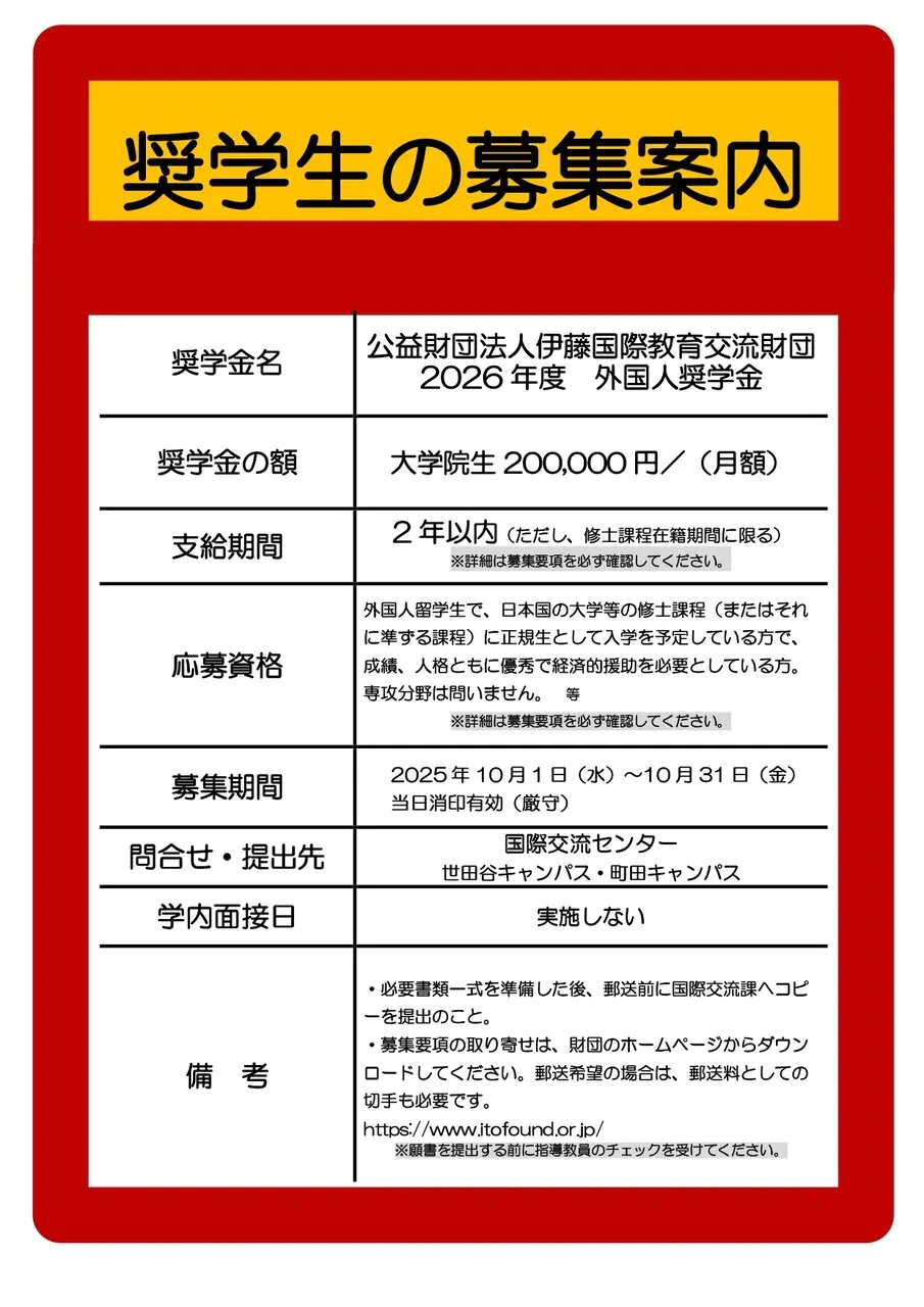 【募集】伊藤国際教育交流財団 2026年度 外国人奨学生
