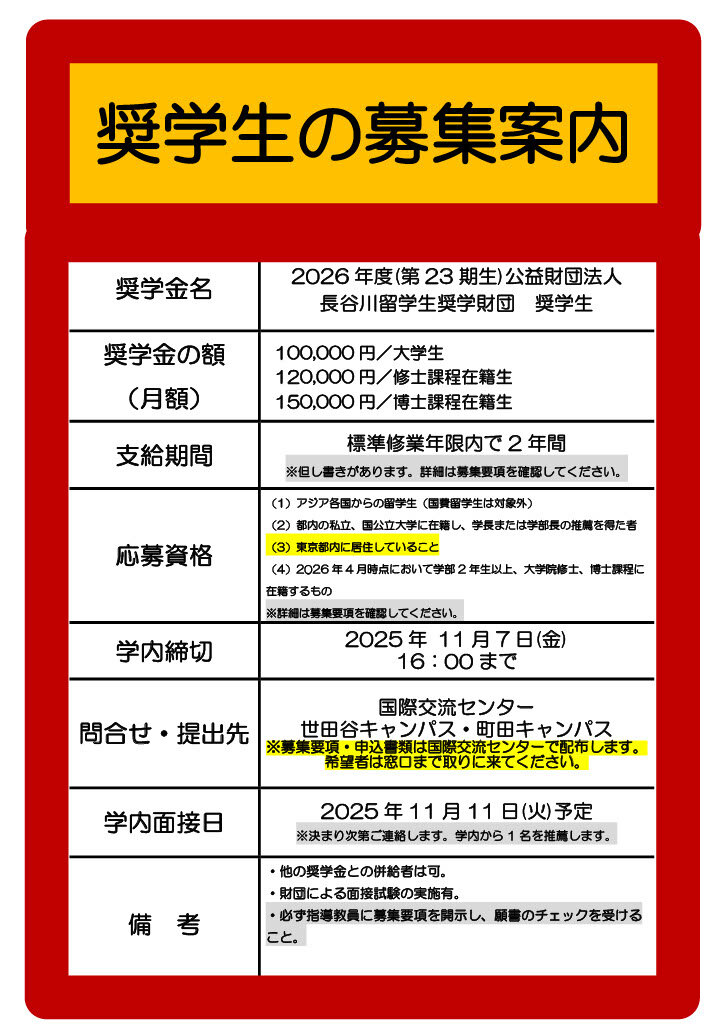 【募集】長谷川留学生奨学財団 2026年度 外国人奨学生