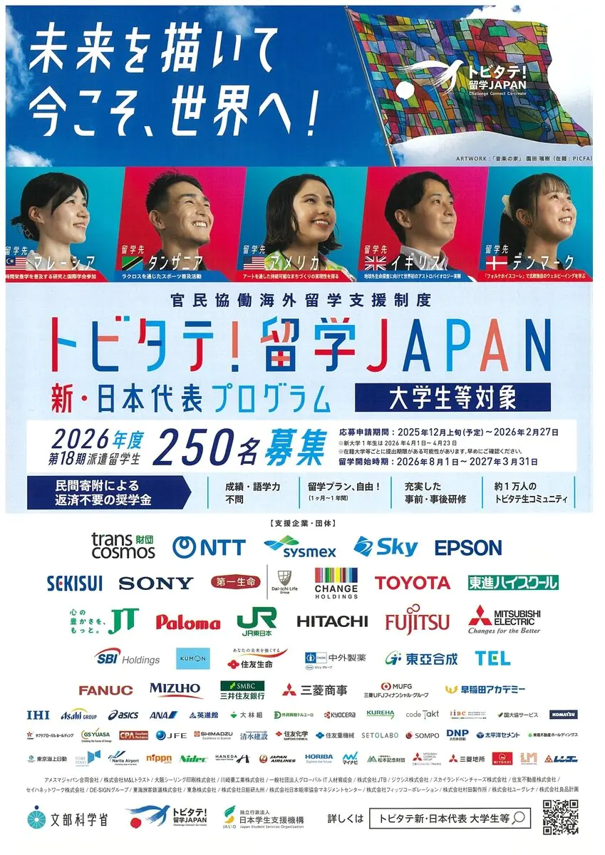 文部科学省が提供するトビタテ!留学JAPAN新・日本代表プログラムの参加者を募集します。