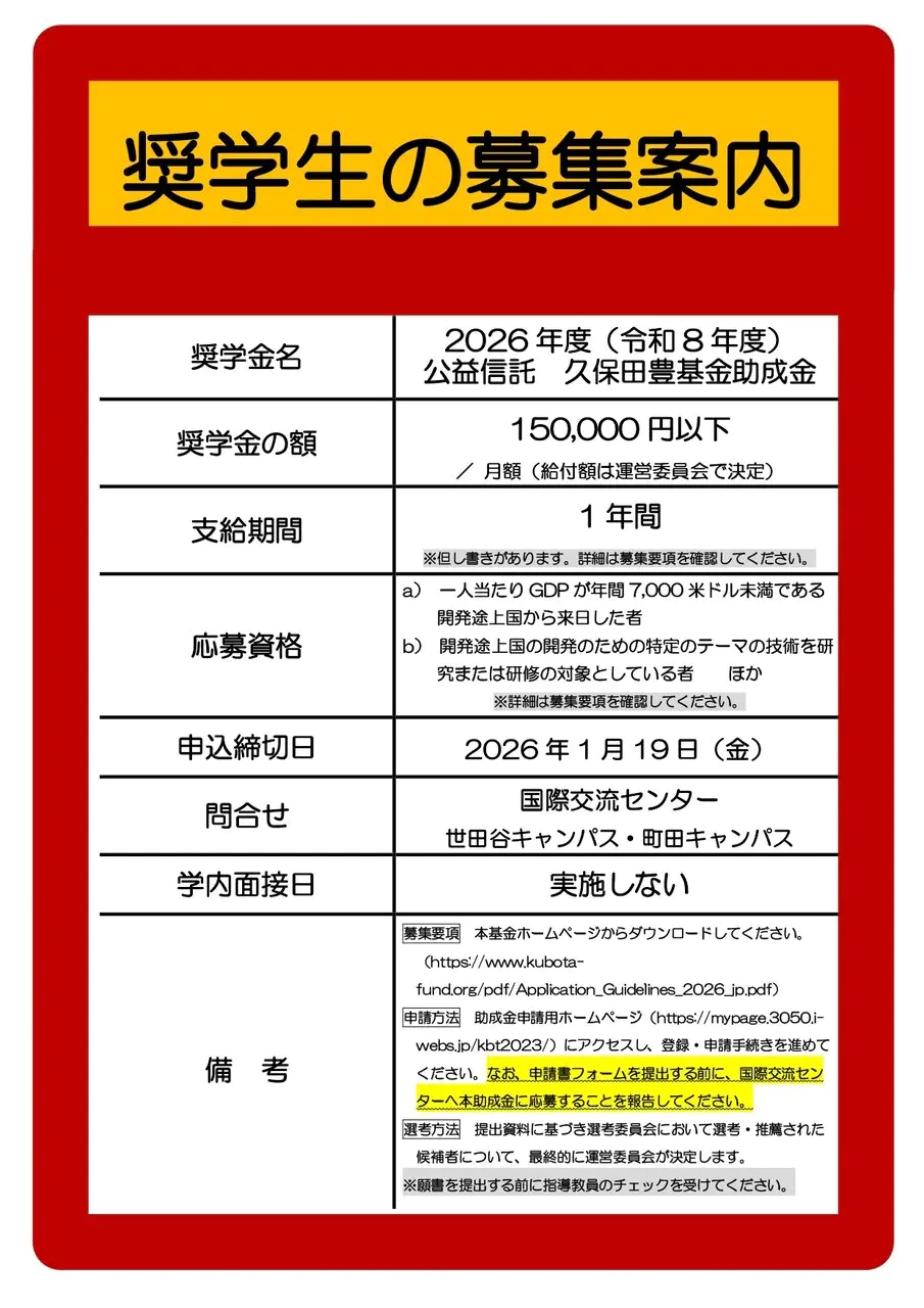 【募集】2026年度 久保田豊基金助成金 奨学生