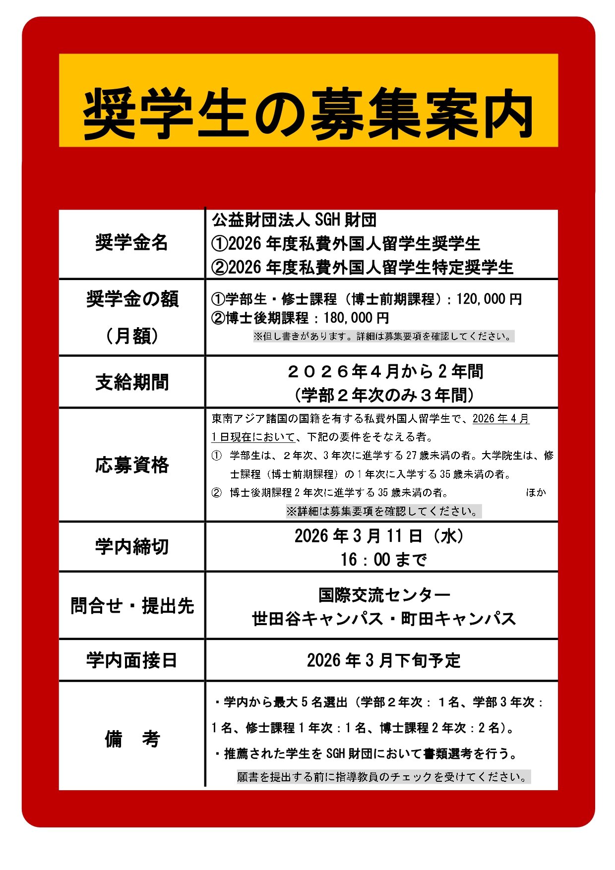【募集】2026年度 公益財団法人SGH財団 奨学生