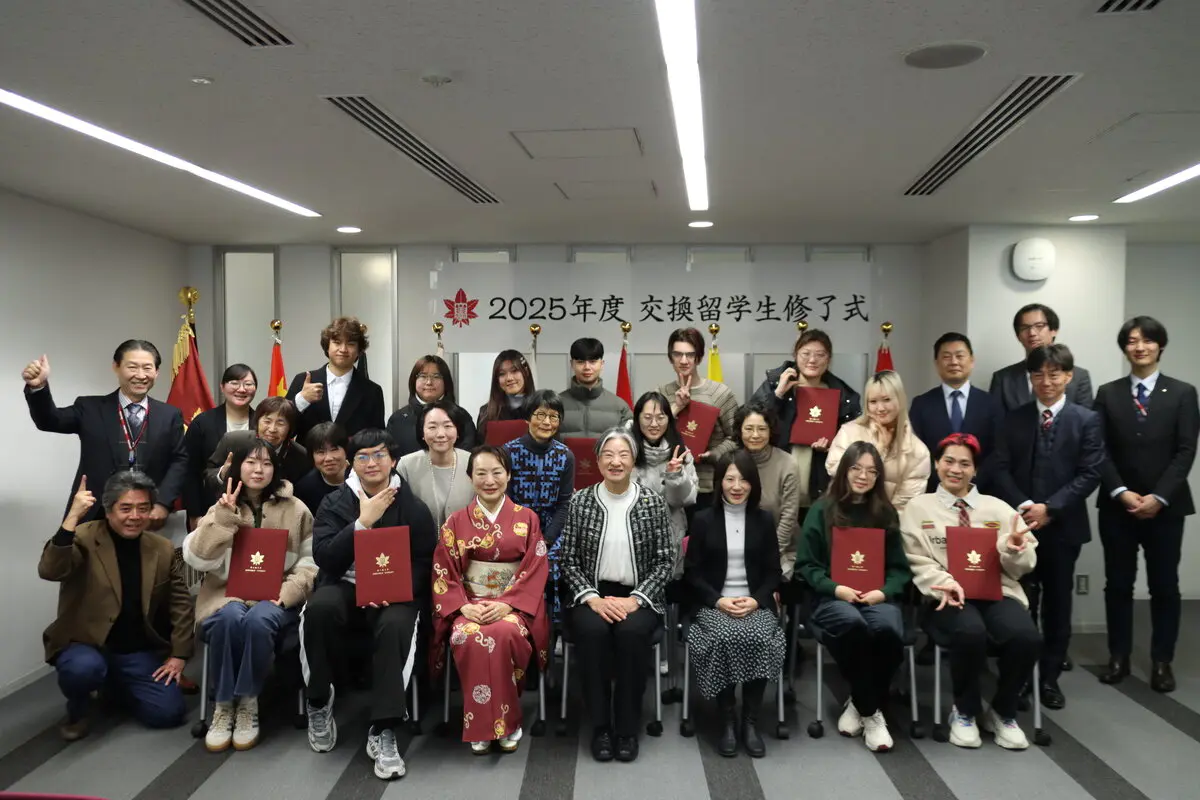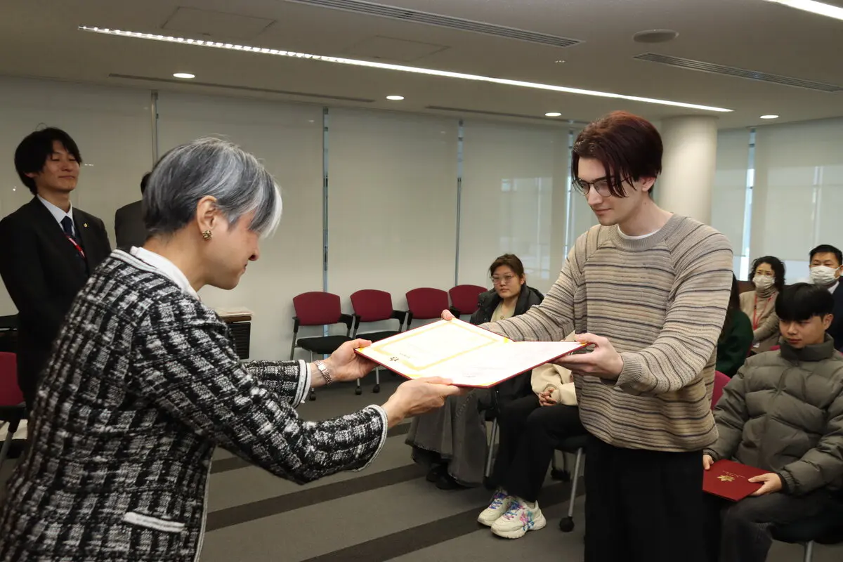 令和7年度交換留学生修了式が世田谷キャンパスの34号館3階会議室Bで挙行され、約1年間本学で学びを修めた7カ国の交換留学生11人に修了証が贈られました。