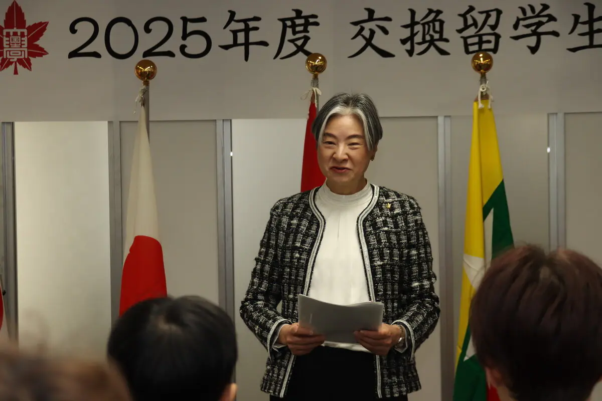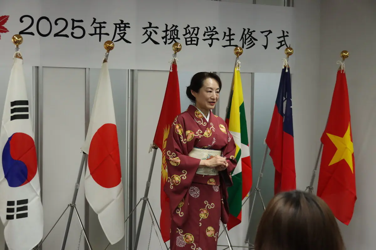 続いて、砂田恵理加国際交流センター長のあいさつでは「日本晴れ」について触れ、雲がない空という意味とは別に、心が晴れやかという意味を紹介し、「今日の日が日本晴れだったこと、修了式が良い日だったことを忘れず、日本における交換留学が良い経験になったことを友人やご家族の方にぜひ話してほしい」と述べました。