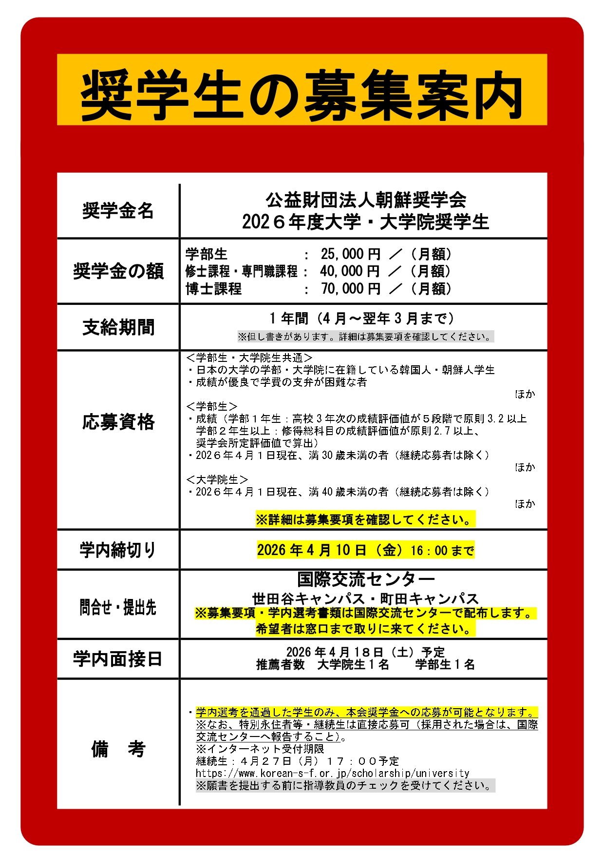 朝鮮奨学会 2026年度 奨学生募集