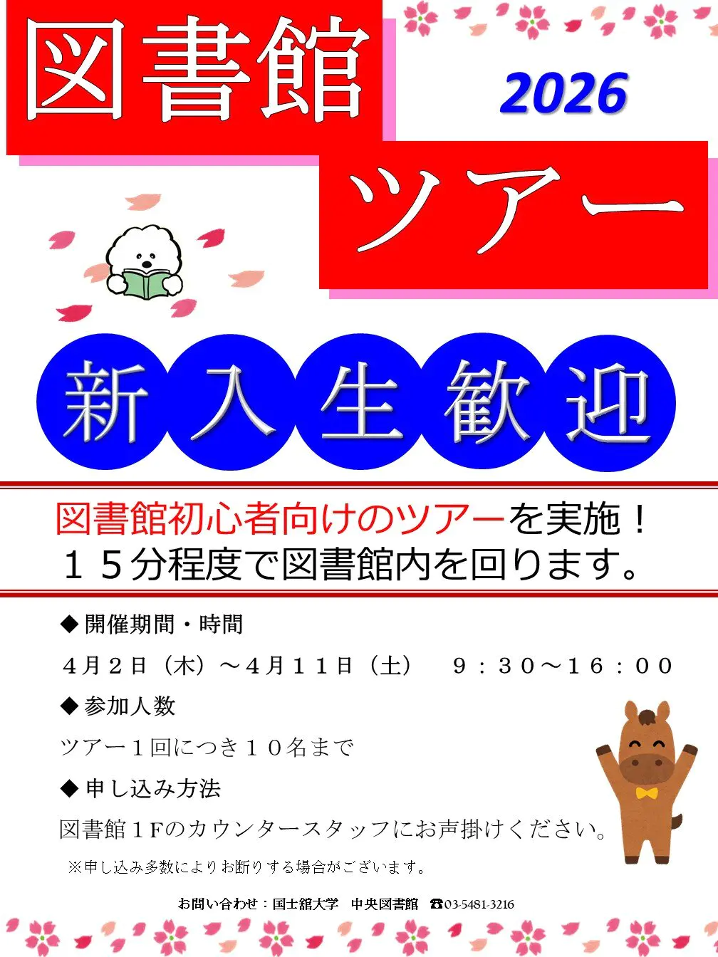 2026.04.02 【中央図書館】図書館ツアーを開催します! 中央図書館では4月2日(木)~4月11日(土)の期間、「図書館ツアー」を開催します。 図書館スタッフが館内を一緒に歩きながら、さまざまなサービスや設備をご案内します!お1人での参加も、お友達同士での参加も大歓迎です。参加したい方は中央図書館1Fカウンターにお気軽に声をかけてください♪