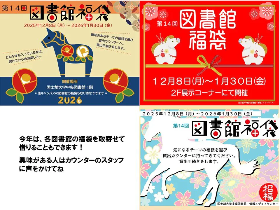 2025.12.08 【3館同時開催】図書館福袋を開催します! 今年もやってきました、「図書館福袋」中央図書館・鶴川図書館・多摩図書館の各館で開催します。今年は、各図書館の福袋を取寄せて借りることもできます!期間は12月8日(月)から1月30日(金)までです。数に限りがありますので、貸出はお早めに。福袋にどんな本が入っているかは、開けてみてからのお楽しみ!書かれたテーマを頼りに本とあなたの縁をつないでください。