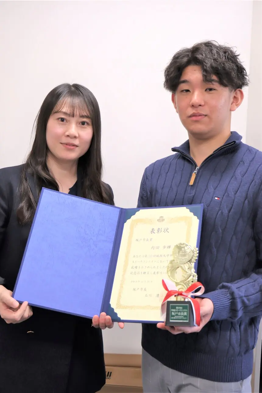 大学の掲示板で見た城西大学中国語スピーチコンテストに出場し、坂戸市長賞を受賞しました。胡杰先生や江林先生にご指導いただき、感謝しています。現在、HSK5級を取得していますが、6級以上を目指し、実用的な語彙力も伸ばしていきたいです。