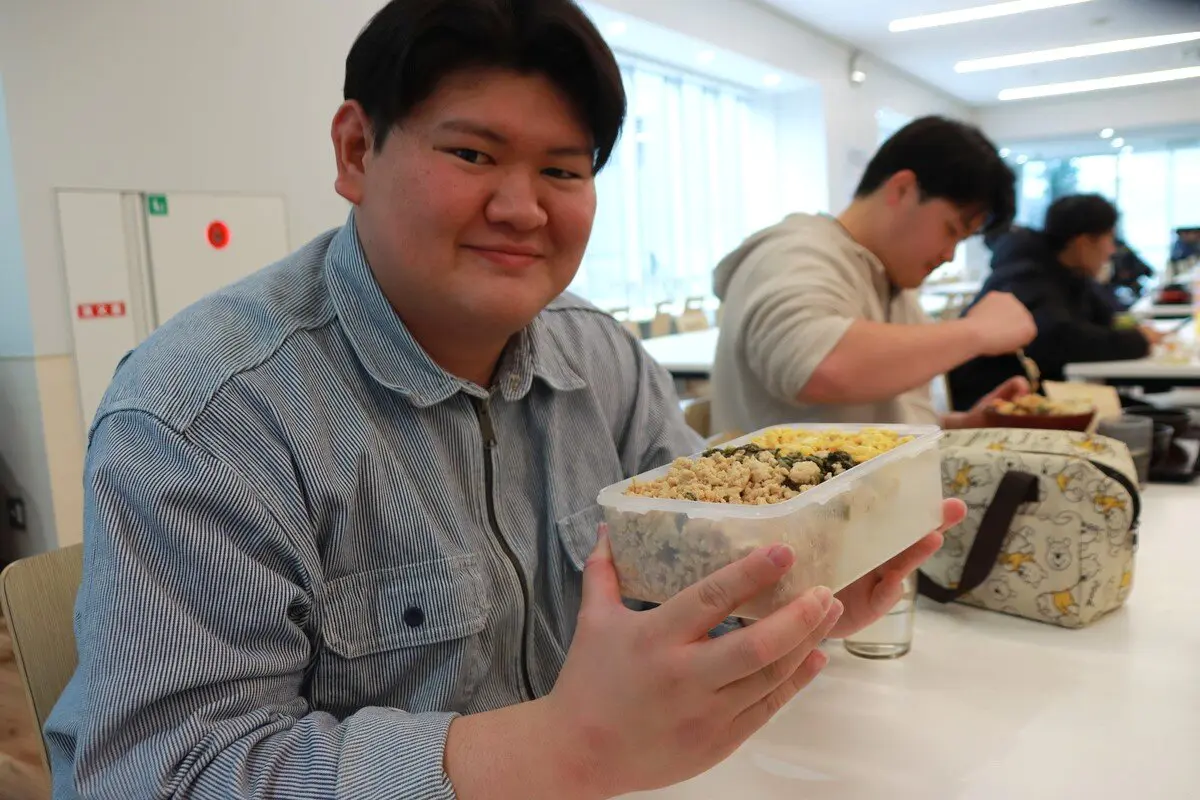 3合分のお米と卵、野菜、お肉が入っている栄養抜群の昼食で、午後の授業と稽古に備えてしっかりエネルギー補給します。