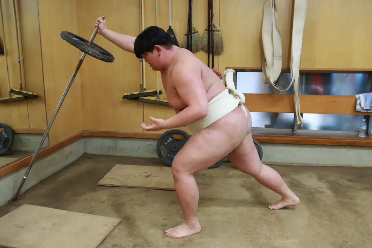 まわしをつけ、スイッチを入れて相撲道場で稽古に取り組みます。