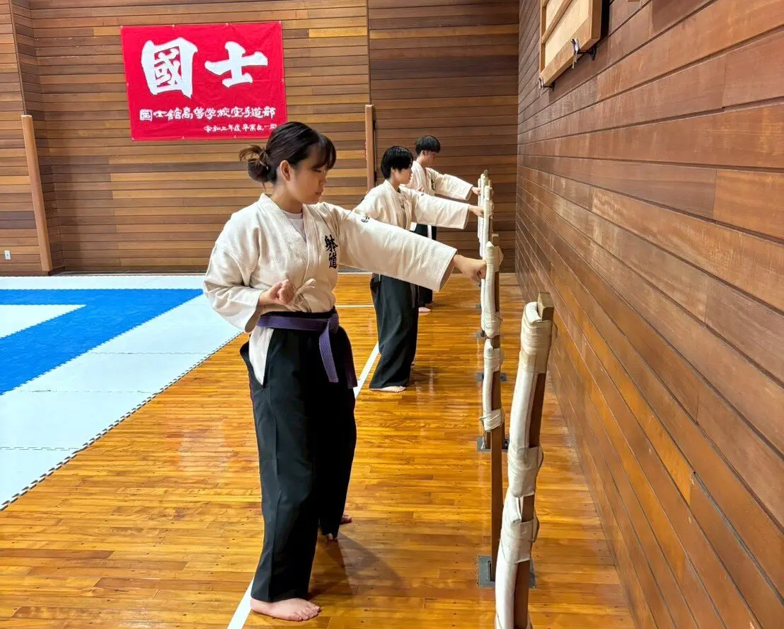 躰道部に所属しています。空手から派生したアクロバティックな武道で、バク転ができるようになるらしい、という理由で入部しました。学内に先輩がいないためOBOGの方々ご指導いただきながら活動しています。1年生から主将を務めており、部員や監督に支えれれながら日々励んでいます。寒稽古や楓門祭などの学校行事にも参加しています。Instagramを定期的に更新しているので是非ご覧ください。