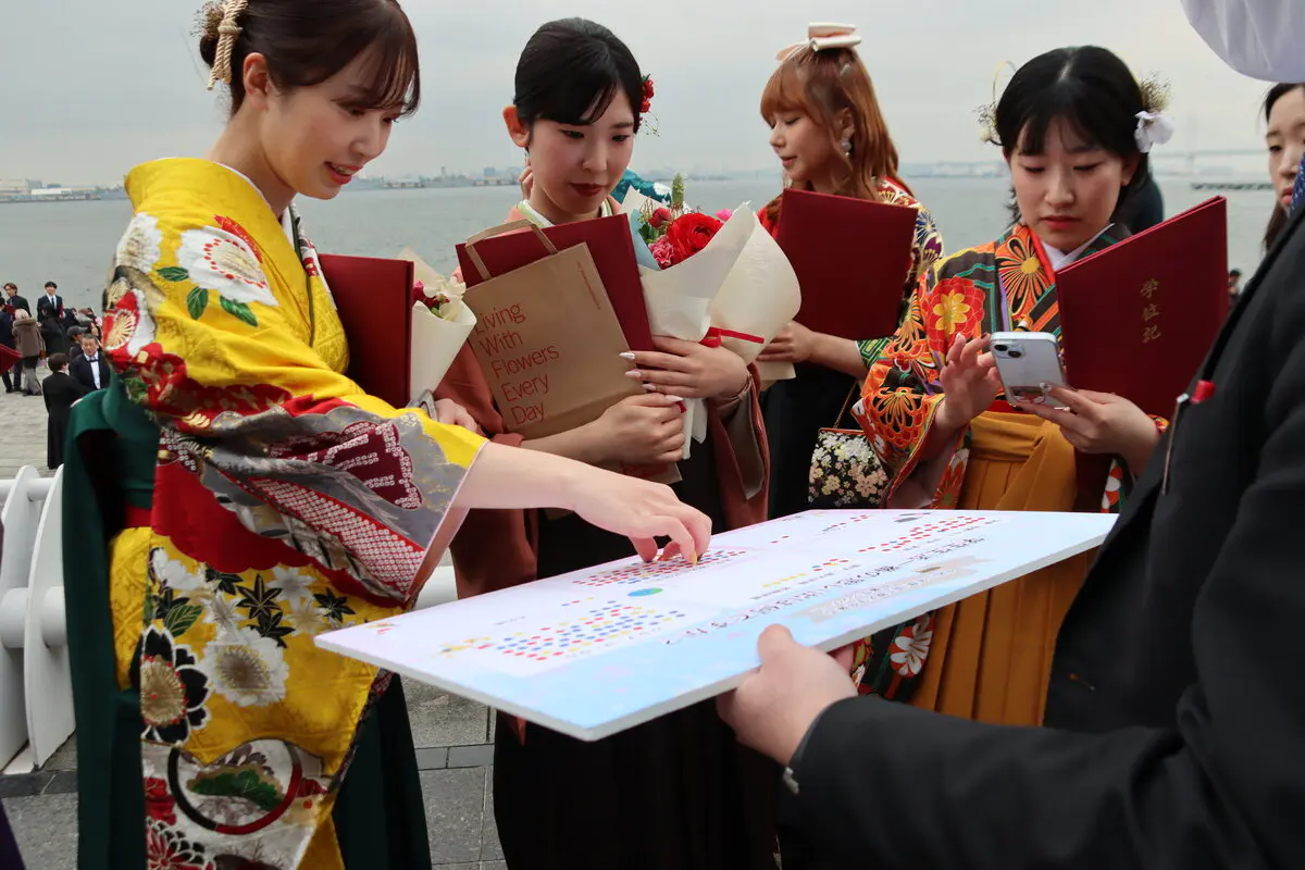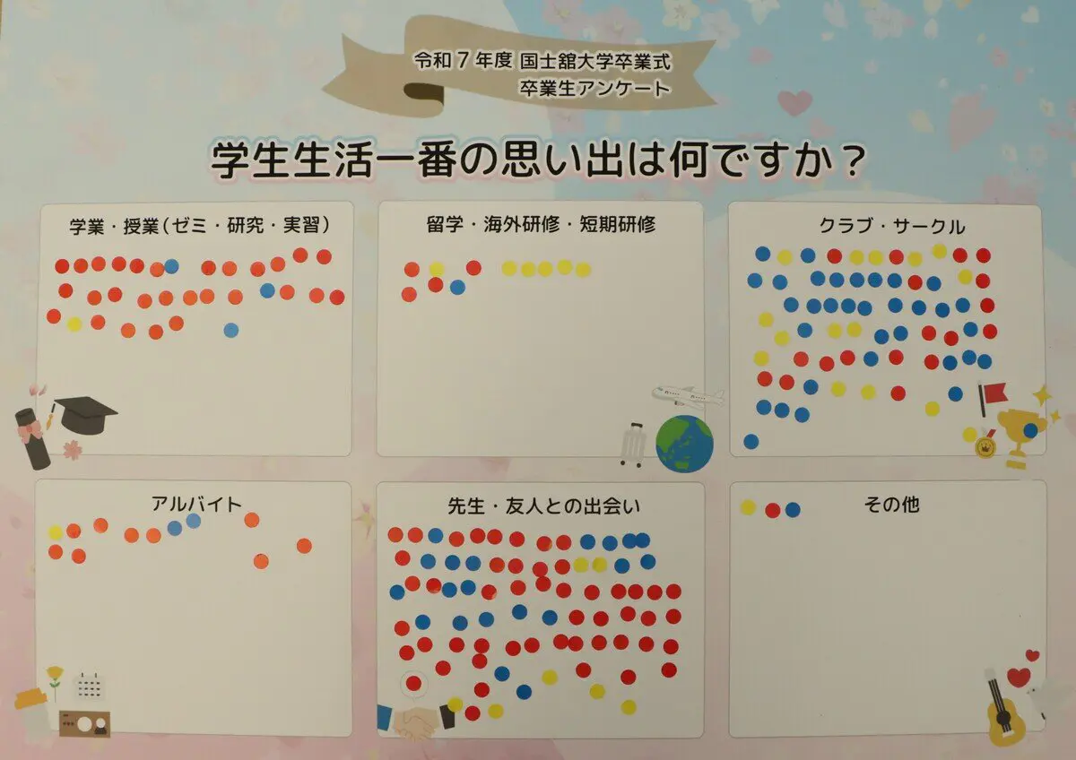 「学生生活一番の思い出」についてアンケートを行いました。約200名の卒業生にご協力いただき、世田谷キャンパスに通学する学生は赤シール、町田キャンパスに通学する学生は黄色シール、多摩キャンパスに通学する学生には青色シールを貼ってもらいました。