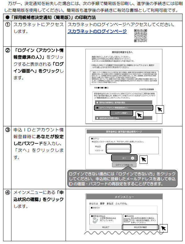 申込み時に入力をしたスカラネット(WEBサイト)から採用候補者決定通知の簡易版が発行可能です。