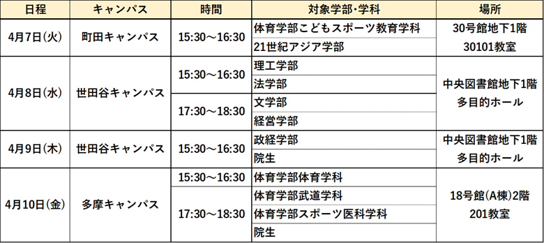 ◆該当日にやむを得ない事情(履修相談や授業など)により参加が難しい場合は 該当学部学科の開催日の
