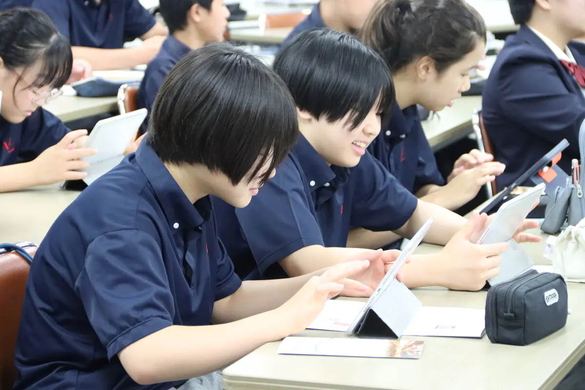 最後に、中高創設90周年記念DVDを視聴し、タブレットを用いた10問クイズに挑戦するなど楽しみながら学習内容を復習しました。