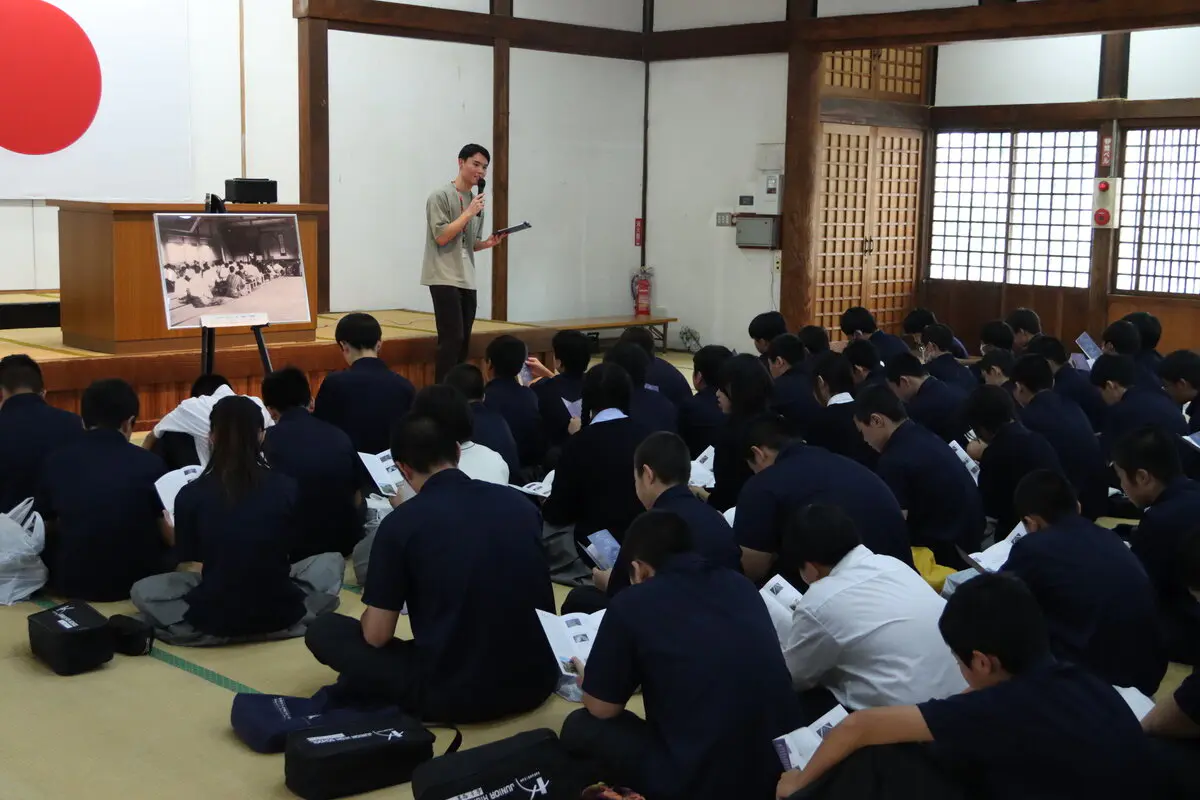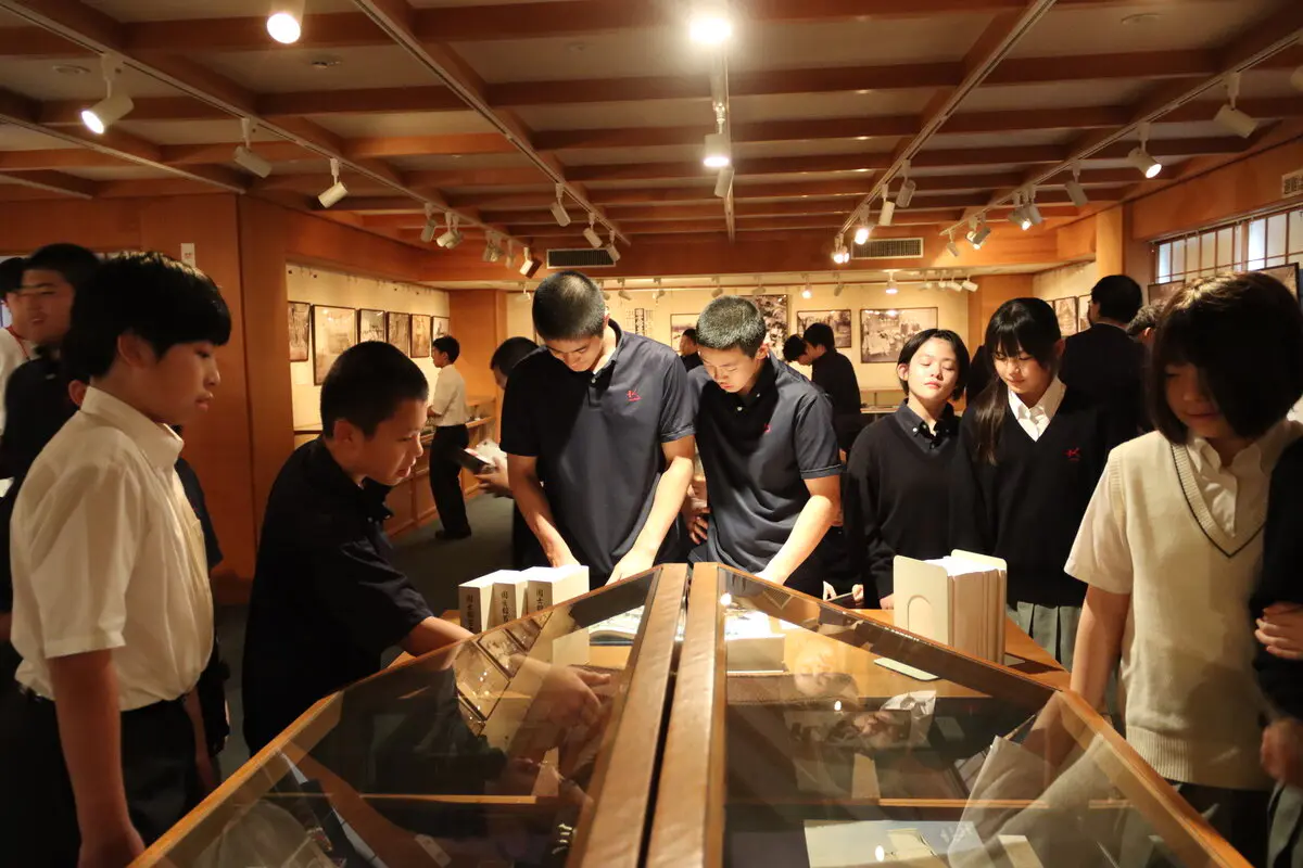 その後、柴田会舘に移動し、「国士舘の歴史」の講話や展示資料の見学が行われました。講話では、創立者柴田德次郎の生い立ちから国士舘の創立に至るまでの数々のエピソードが紹介され、生徒らは創立者の信念や建学の精神などへの理解を深めました。講話中には、柴田が作詞した国士舘舘歌に関する説明もされ、生徒全員で合唱する一幕も見られました。展示資料の見学では、国士舘史資料室職員の解説のもと、写真や手紙などの歴史ある展示資料を見学し、当時の時代背景や先覚者たちへの想像を膨らませました。
