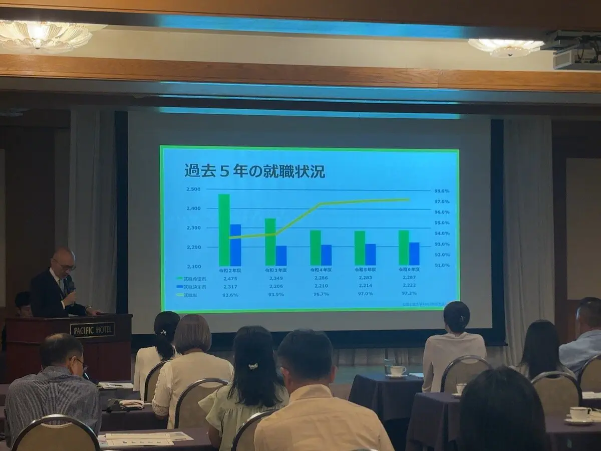 第Ⅰ部全体会では、田原淳子学長から、本学の特色や教育方針および教育活動の説明、教育後援会山根潤幹事長から、本会の取組みについて紹介しました。続いて、キャリア形成支援センター福永晶彦センター長から本学の就職や進路状況および支援体制の説明をした後、開催県である岡山県産業労働部のご担当者をお招きして、U・I・Jターンの取り組みについて紹介いただきました。最後に細越淳二教務部長から授業の様子や履修・成績評価、修学状況などについて説明を行いました。